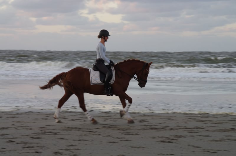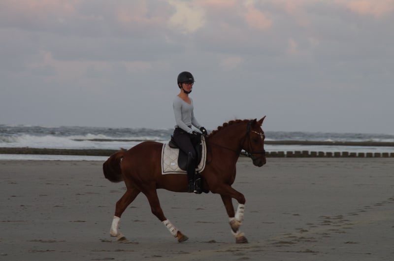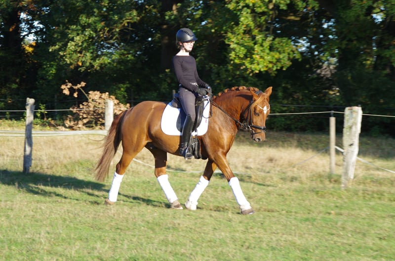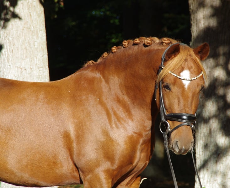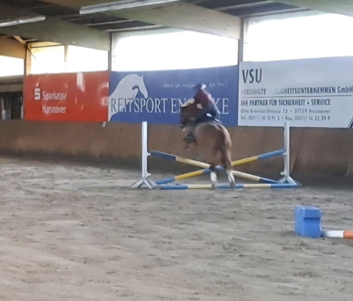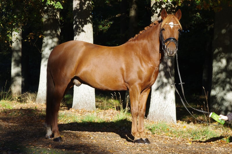 Pinot Noir - bei uns "Pino" - ist ein wunderschöner Ponywallach mit viel Charme und einem Herz aus Gold. Er ist 2020 geboren und ist aktuell 1,45m groß und bleibt damit auch sicher im Maß. Er hat 3 gute Grundgangarten, wobei besonders sein bergaufgesprungener Galopp hervorzuheben ist. Pino wurde von mir als Amateur 4 jährig schonend angeritten und bisher vor allem Dressurmäßig gefördert. Letztes Jahr konnte er sich mehrfach in A* und A** Dressur vorne platzieren - mit Noten bis 8,0. Ich habe ihn diese Saison auch schon in L* vorgestellt. Er ist ein liebes Pony, welches sich immer bemüht die Hilfen des Reiters richtig umzusetzen. Er läuft in der Abteilung problemlos vorne und hinten und kennt es auch mit Ausbindern geritten zu werden. Er ist allerdings nicht Anfänger geeignet und benötigt einen ruhigen Reiter, der einen gefestigten Sitz hat (so Dressurreiter-WB Niveau). Ich kann ihn mir durchaus auch für ein sicher reitendes Kind vorstellen mit entsprechender Hilfe. Ebenso wäre er natürlich auch für kleine Erwachsene geeignet. Weiteres dazu gerne im persönlichen Gespräch. Er geht inzwischen - auch alleine - super artig ins Gelände. Weiterhin war ich mit ihm letztes Jahr auch am Strand auf Norderney, wo er sogar erfolgreich Turnierprüfung gelaufen ist. Im Springen wurde er bisher noch nicht weit gefördert, er kennt Stangenarbeit und Cavalettis und kleine Kreuze, dies absolviert er zuverlässig. Im Umgang ist er ein absoluter Schatz, sehr liebenswürdig und absolut artig und unkompliziert. Er ist schmiedefromm (aktuell vorne beschlagen) und verladefromm (geht alleine auf den Anhänger). Ich kann ihn mir daher sehr gut für jemanden vorstellen, der in den Turniersport einsteigen möchte, da er super unkompliziert und brav auf Turnier ist, auf dem Anhänger steht wie ne Eins und sich super Verladen lässt etc. Er klebt nicht und kennt es auch alleine zu bleiben. Aktuell steht er nachts in der Box und tagsüber den ganzen Tag draußen, ich könnte mir ihn ebenso aber auch im Offenstall vorstellen. Bei mir steht er in Wallachgesellschaft und zeigt sich hier sehr sozial, rangniedrig und verspielt. Er ist natürlich regelmäßig geimpft und entwurmt und Zähne wurden gemacht. Bei mir war er immer gesund und zeigt sich sehr robust. Er steht korrekt auf den Beinen und hat ein gutes, stabiles Fundament. Ich gebe dieses absolute Traumpony nur in allerbeste Hände! Ich habe keinen Verkaufsdruck und wünsche mir ein tolles - am liebsten Für immer-Zuhause mit guter Haltung für Pino, wo er weiterhin gefördert, geliebt und wertgeschätzt wird. Platz vor Preis! Sein Zubehör (Passier Sattel, Trense, vers. Horseware Decken) kann bei Interesse gerne mitübernommen werden.