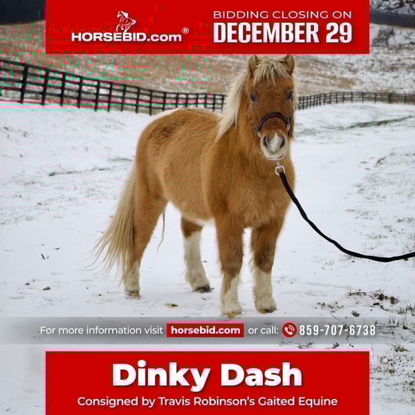 ⚜️𝐓𝐇𝐄 𝓗𝓮𝓻𝓲𝓽𝓪𝓰𝓮 𝐖𝐢𝐧𝐭𝐞𝐫 𝓒𝓵𝓪𝓼𝓼𝓲𝓬⚜️ Happening now thru MONDAY | DECEMBER 29th - Available EXCLUSIVELY on HorseBid's website! For more details and to register visit: www.Horsebid.com CONSIGNOR CONTACT: Travis Robinson’s Gaited Equine 859-707-6738 LOCATION: Paris, KY BREED: Pony REGISTERED: No COLOR: Brown/White spotted HEIGHT: 39 inches AGE: 8 GENDER: Gelding Meet “Dinky Dash”, I purchased this little guy for my daughter and nieces/nephews about 5 years ago for them to play around on. He’s been a GREAT pony! Extremely happy go lucky and very safe, not a mean bone in his body. The kids here basically just led each other around and treated him more like a pet. The owner before me had small children and that’s what they were doing as well but they ended up having to move and didn’t have a place to take him to and that’s how I was able to buy him. The kids have grown since then and didn’t mess with him as much over the past year and he’s just too good of a pony to go to waste. In June of this year I took him to an Amish friends of mine to let his children “train” him for more of everyday activities to get him completely well rounded and get a ton of exposure. He’s spent the last six months there getting a ton of training and usage. I picked him up two weeks ago and was actually blown away at everything they had him doing. He’s actually had a job, been driven all over the place, ridden all over the place, and isn’t spooky of anything! He’s the perfect little pony, especially for a beginner, more woah than go but will go if asked, but he’d prefer to walk along. He stands 39 inches, gelding, 8 years old, and has amazing hooves. If you’re looking for something SAFE, FRIENDLY, and SOUND in the body and mind he’d definitely be worth considering.