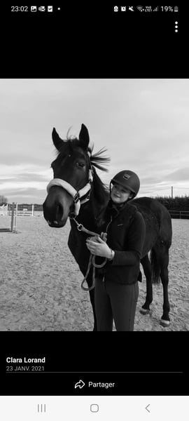 Tu cherche une petite jument énergique avec un grand cœur, Tu es un cavalier(e) confirmé(e) Je t'attends Viens me rencontrer J'ai déjà fait du saut jusqu'au 1 mètre en concours et je pars seule en promenade Il faut que je sorte régulièrement car j'ai beaucoup d'énergie A pied je suis hyper Respectueuse aussi, je me laisse longer en libertée A bientôt