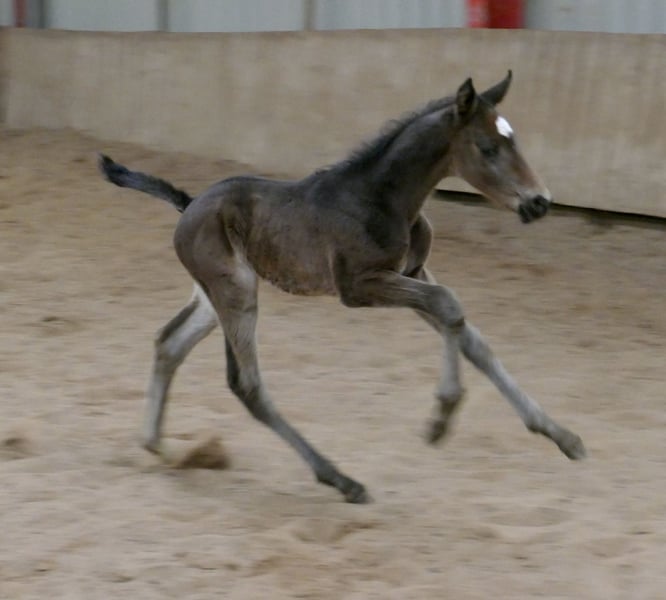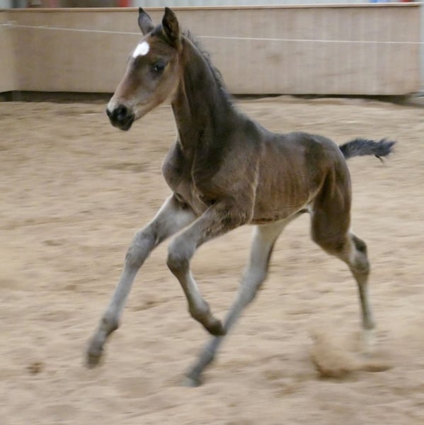 Corvin A – schwarzbraunes Hengstfohlen mit hochkarätiger internationaler Springabstammung. Ausgestattet mit drei sehr guten Grundgangarten, viel Elastizität und auffallender Bewegungsqualität präsentiert sich Corvin A als hochmoderne Nachwuchshoffnung für den Spring- und Vielseitigkeitssport. Sein Pedigree vereint bewährte Leistungsblutlinien: Väterlicherseits führt er über Cadiz (Cordess–Clinton) wertvolles Clinton- und Heartbreaker-Blut, kombiniert mit Shakespeare und Potsdam NRW. Die Mutterlinie bringt über Chaman (Baloubet du Rouet x I Love You) sowie Ismo (Ilasso x First Gotthard x Zeus) weitere international erfolgreiche Springgene ein. Ein sehr modernes, langbeiniges Hengstfohlen mit viel Übersicht, Kraft aus der Hinterhand und sportlichem Auftreten – hochinteressant für ambitionierte Reiter und den gehobenen Sport. Corvin A von Cadiz (Cordess-Clinton x Heartbreaker x Shakespeare x Potsdam NRW) x Chaman (Baloubet du Rouet x I Love You) x Ismo (Ilasso x First Gotthard x Zeus).