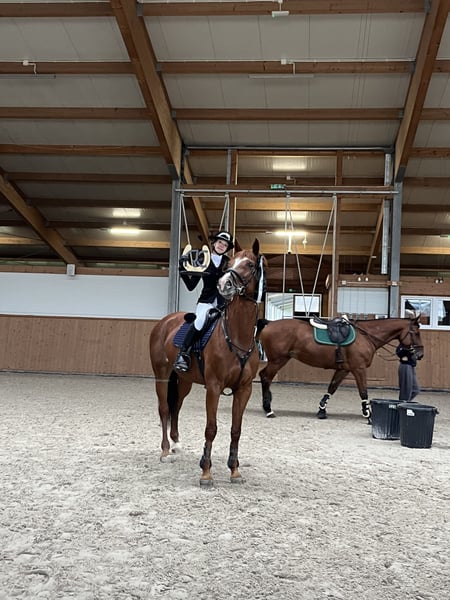 Chestnut mare from Greater Poland with a heart for show jumping. Perfect for riders beginning their competitive journey. At home, she was ridden by three young riders aged 15, 15, and 17. She is well-behaved with the farrier and veterinarian and is under the care of a physiotherapist. She is gentle in handling, does not bite or kick (she is a sweet mare). Quick, agile, and precise in the show jumping arena. Healthy and injury-free (TUV available for review from January 2024). She has been trained at home up to 120 cm. She has competed multiple times in the LL class, often placing in the ribbons, and has also participated in the L class. Due to her athletic pedigree, she would also be suitable for breeding. It is very important to me that she finds a loving home. Sale due to the desire to further develop her potential.