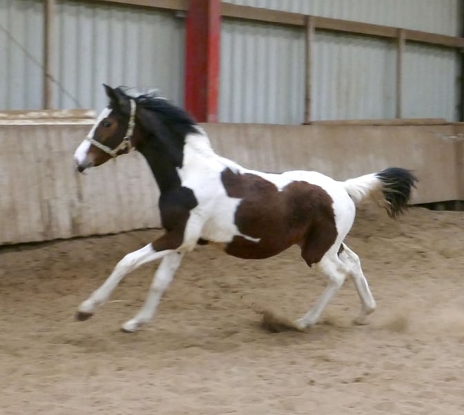 Sehr typvolle gescheckte Jährlingsstute Casey A aus leistungsgeprägter internationaler Springabstammung. Väterlicherseits abstammend von Cadiz (Cordess-Clinton x Heartbreaker x Shakespeare x Potsdam NRW), mütterlicherseits über Zinedine (Guidam x Heartbreaker) und Ismo (Ilasso x First Gotthard x Zeus) – eine international bewährte Springgenetik. Die junge Stute zeigt sich sehr bewegungsstark, elastisch und mit viel Übersicht ausgestattet – beste Voraussetzungen für Springen oder Vielseitigkeit. Neben ihrer sportlichen Perspektive besticht Casey A durch einen ausgeglichenen, menschenbezogenen und sehr angenehmen Charakter.