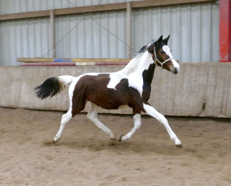 A very typy, pinto foal mare, Casey A, with a performance-oriented, international show jumping pedigree. On the sire's side, she descends from Cadiz (Cordess-Clinton x Heartbreaker x Shakespeare x Potsdam NRW), while on the dam's side, she is related through Zinedine (Guidam x Heartbreaker) and Ismo (Ilasso x First Gotthard x Zeus) – a proven international jumping lineage. The young mare exhibits strong, elastic movement and a lot of scope, making her well-suited for show jumping or eventing. In addition to her sporting potential, Casey A impresses with her balanced, people-oriented, and very pleasant temperament.