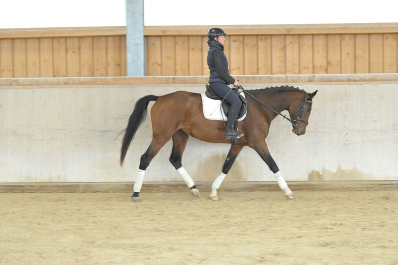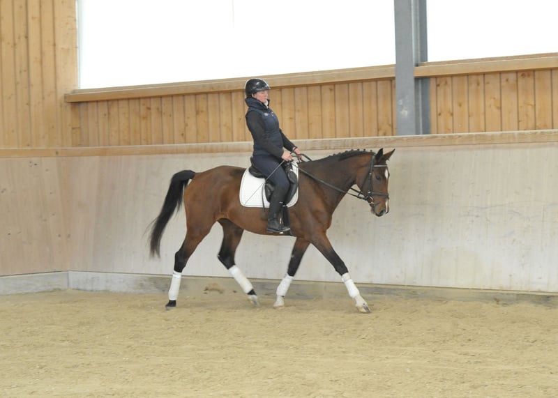 Gundi ist eine elegante, sehr rittige Caraoki Nachkommenstute mit Doppeltalent ausgestattet. Sehr angenehm zum Sitzen, einfach durchs Genick, mit super Einstellung. Tolle Ausbildungsstute für alle Sparten, für Dressur, Halle und Gelände. Eine Empfehlung für nicht ganz so große Reiter.