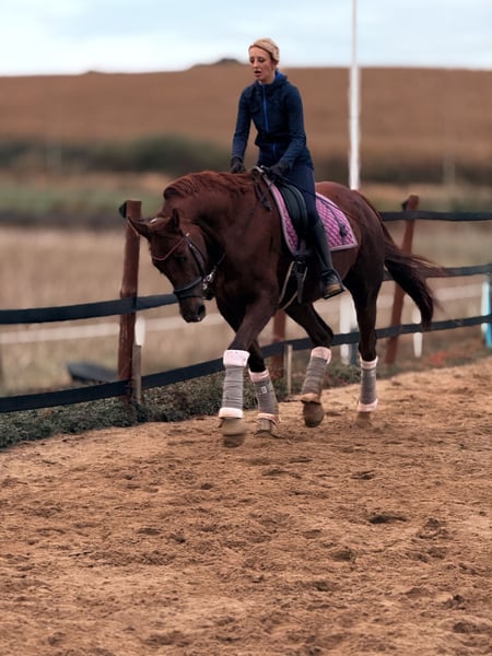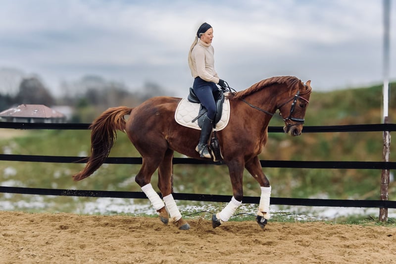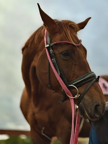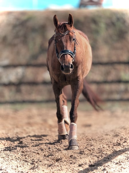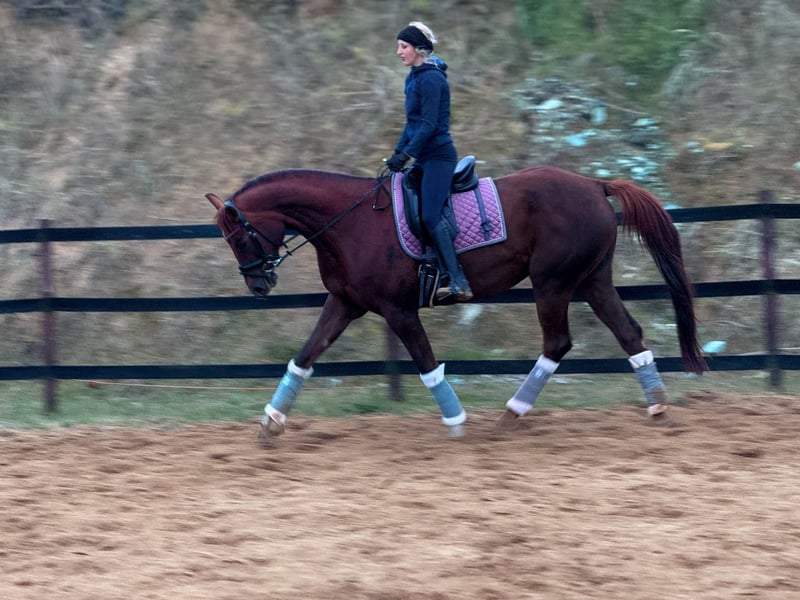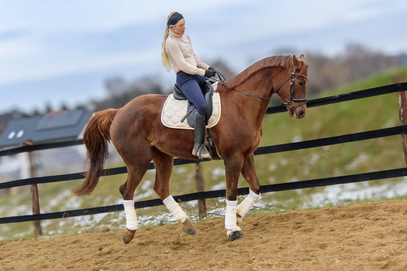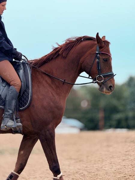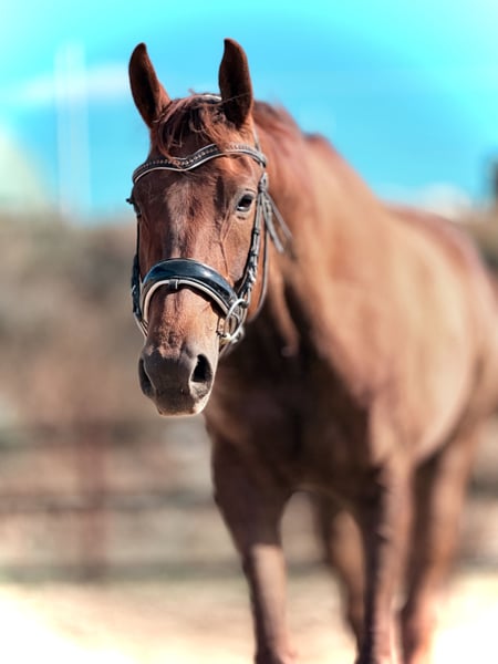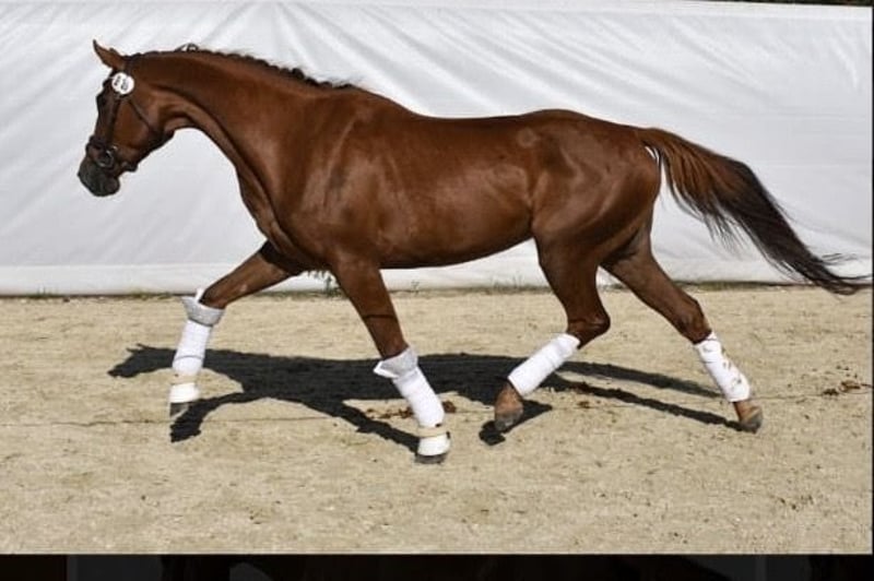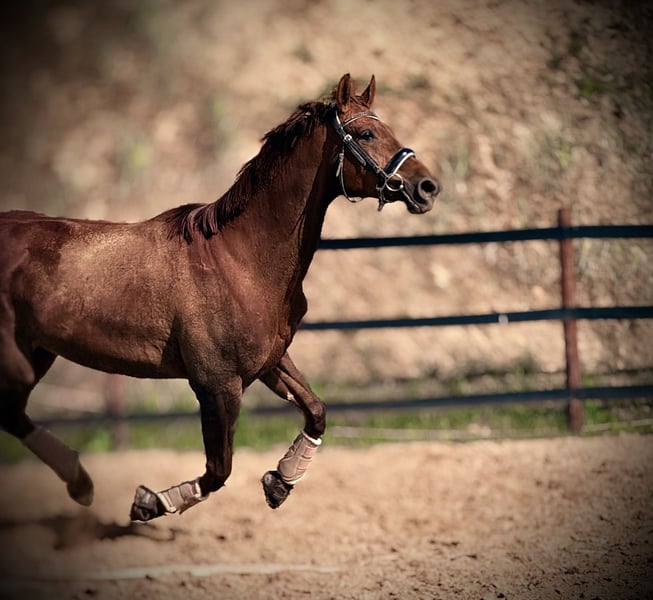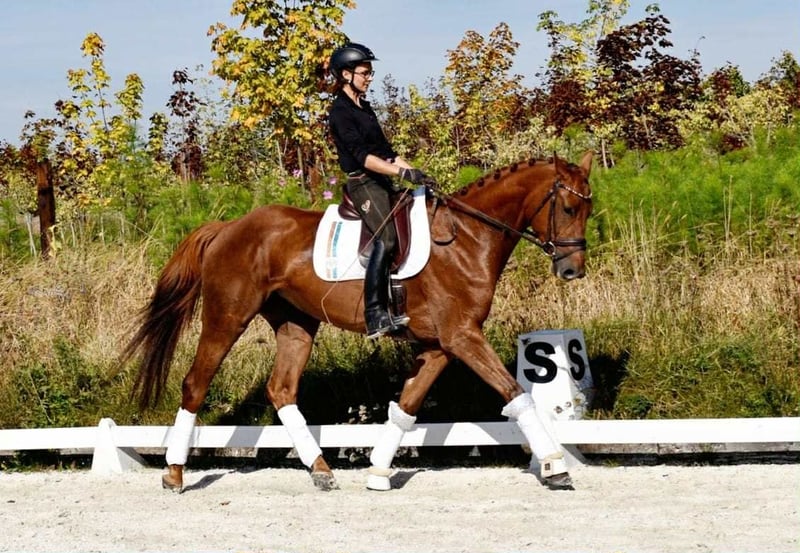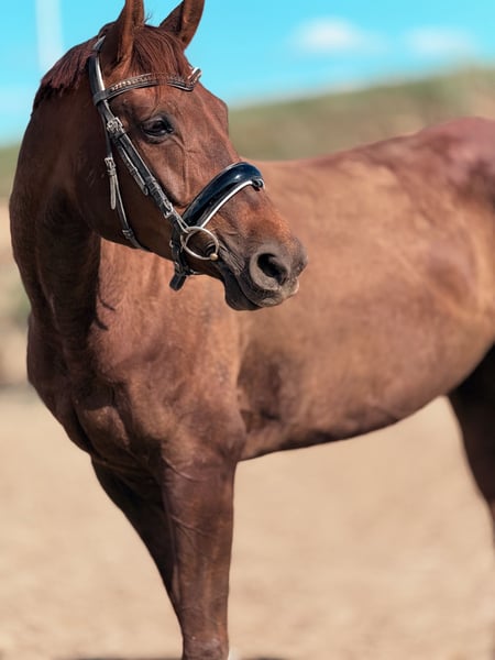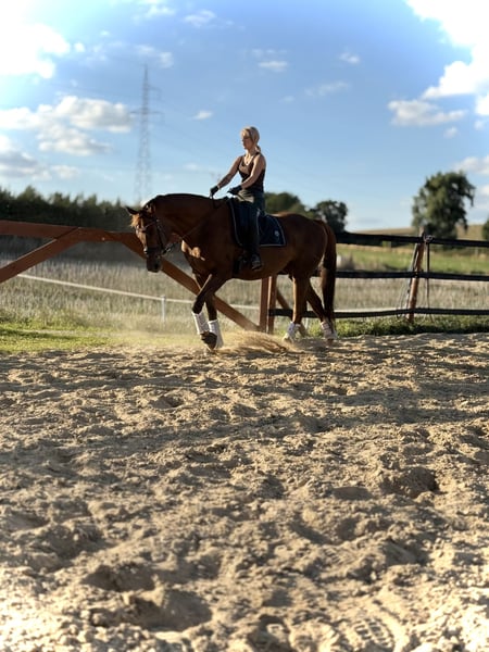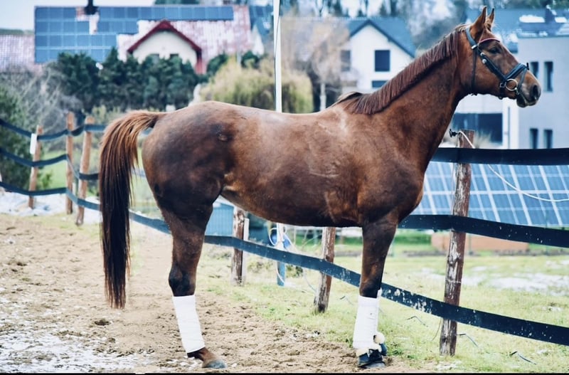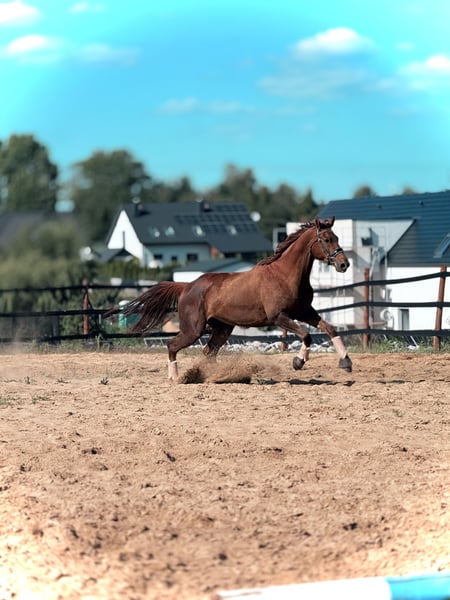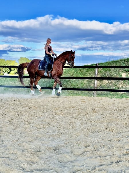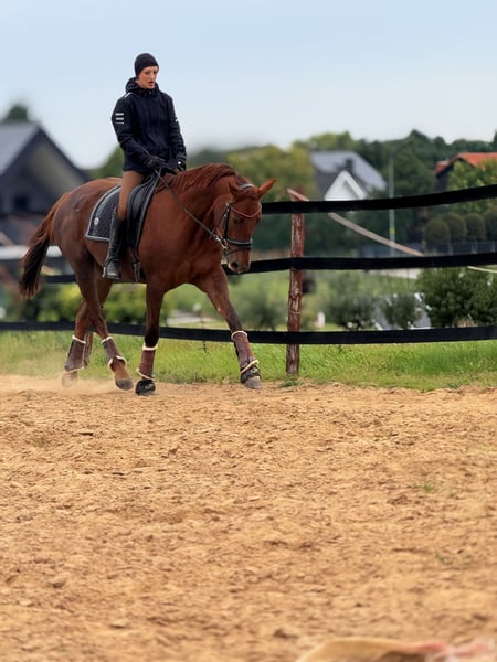 mare for sale (8 years old); sired by Empire (Hanoverian) and out of Metaxa (Sp). A real eye-catcher with a stunning dark chestnut coat, approximately 16.1 hh at the withers. A prospect for eventing, very quick, agile, and attentive mare. Loves jumping – has never refused or stopped before an obstacle in her life. Very friendly and people-oriented. She has her own character but is a highly sensitive horse that requires consistent daily work and clear signals to understand her. She is very focused on the rider, bombproof, and confident in the terrain. She jumps everything, never balks or refuses – she truly enjoys jumping. She has been in a light training break for two years. Due to the lack of a rider, her price will increase with resumed training and skill development – currently €45,000. Currently in dressage training, as she is without a saddle. More information available via private message. *Possibility of mare leasing – without transfer of ownership – located at Heaven - Świątniki Horse Stud.