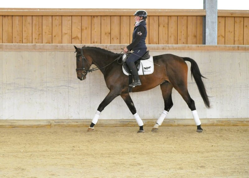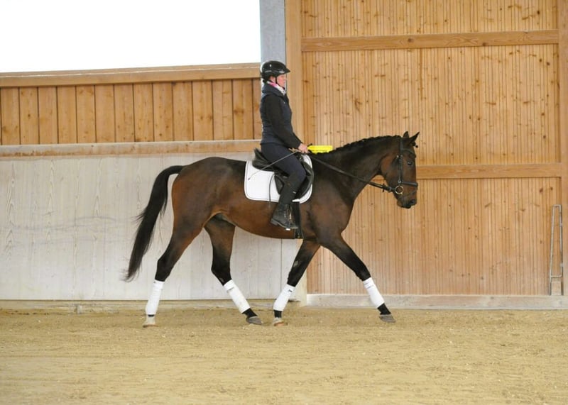 Schicker und liebenswerter dunkelbrauner Wallach mit Chic und Charme! Aufmerksamer Sohn von Caraoki mit drei guten GGA, dazu charmant und liebenswert. Durch sein aufgeschlossenes und ausgeglichenes Wesen schließt man ihn mit seiner süßen Art sofort ins Herz. Stets neugierig und wissbegierig möchte er weiter gefördert werden und ist mit guten Rittigkeitswerten ausgestattet. Sehr typgeprägt ist er für alle Sparten einsetzbar, ob Dressur, Springen oder Gelände. Seinem Alter entsprechend gefördert derzeit auf E-Niveau.