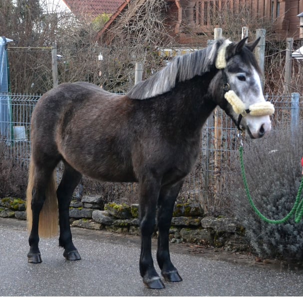 Ipsen, a beautiful, compact small horse with a striking coat and excellent temperament. He has been gently backed in line with his age and performs his job superbly, always well-behaved and balanced. Ipsen exudes calmness and confidence and has also been driven in a two-in-hand. He is equally obedient in the field and always convinced by positive reinforcement. In handling, he is straightforward, allowing himself to be touched and groomed everywhere. He is familiar with the farrier and loading. He is accustomed to agricultural machinery and animals, knows open stable management and herd keeping. Optional: with Aku from a recognized equine clinic.