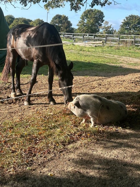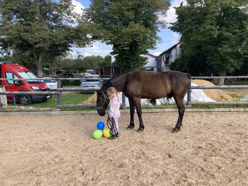 Buddy ist ein extrem menschenbezogener, freundlicher und kinderlieber Kerl. Trotz seines jungen Alters lässt er sich problemlos von Kindern führen, putzen und schmusen. Er lebt derzeit im Offenstall und ist absolut verträglich, geht jedem Ärger aus dem Weg und wird als Integrationshelfer für Neuzugänge genutzt. Maschinen, Hunde, Katzen, Enten, Hühner, Ziegen,Schafe und sogar Schweine sind ihm sehr vertraut und kein Problem. Buddy geht gern spazieren und läuft brav an der Longe. Buddy war bei uns nie krank, geht barhuf. Im Sommer haben wir ihn viel geritten, Reitplatz und Gelände. Leider habe ich auf Grund von Krankheit momentan kaum noch Zeit für ihn. Buddy ist eine sensible Seele die Fremden gegenüber erstmal skeptisch ist. Auf Grund seines Alters kein Anfängerpferd, da er einen kompetenten und sicheren Reiter braucht. Wir wünschen uns ein schönes Zuhause für Buddy, das ihm gerecht wird und ihn voll auslastet um sein Potential voll auszuschöpfen.