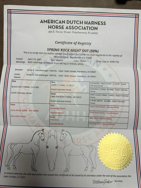 ONLINE AUCTION Place your bids at www.PlatinumEquineAuction.com Starting Bid $3500 Auction ends March 2nd, 2025 Need a new saddle? Check out White Rock Saddles on our website or Facebook! Spring Rock Blackout is a 16.1H, 2021 Model registered Dutch Harness Horse. He is broke to ride and drive both single or double. He rides both English and Western and if you want fancy he is your guy! He has huge potential in the dressage ring as he is an awesome mover and quick learner. He has been ridden and drive through town, down busy highways, been ridden down the trails, across creeks and ditches. He is easy to catch, tack up, brush, shoe, and bathe. He gets along with other horses in the pasture and has no stall issues. Blackout will walk, trot and canter. He takes both leads, lopes nice circles and is easy to ride. He is up to date on all shots and sells sound. For more info contact Silver Star Stables Norman 319-284-0001 with any questions. Located in Sturgis, MI. ONLINE AUCTION Place your bids at www.PlatinumEquineAuction.com Starting Bid $3500 Auction ends March 2nd, 2025 Need a new saddle? Check out White Rock Saddles on our website or Facebook!