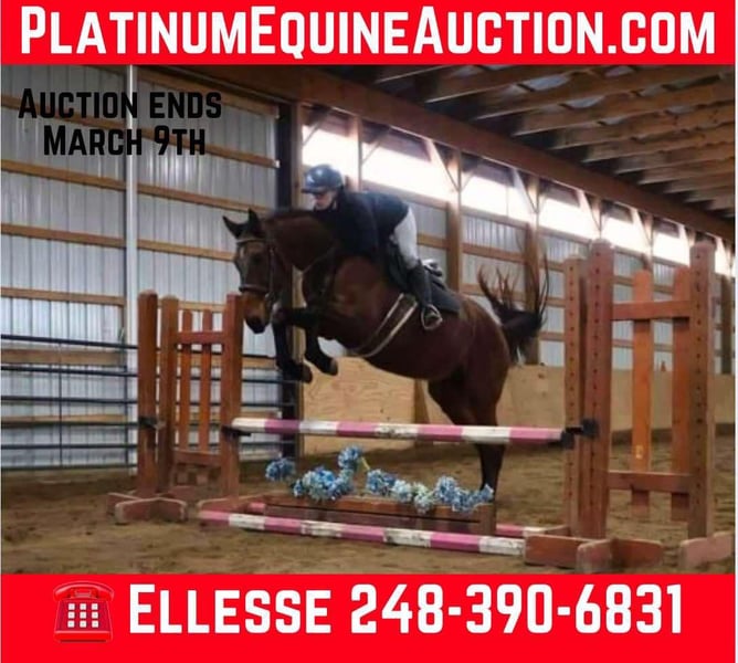 ONLINE AUCTION Place your bids at www.PlatinumEquineAuction.com Starting Bid $3500 Auction ends March 9th, 2025 Need a new saddle? Check out White Rock Saddles on our website or Facebook! Meet Pikachu, this 5 year old, 16hh bay appendix gelding has it all!!! He’s kind, he’s quiet, and he’s ready to be your next show mount. Pikachu has a great walk, a floaty flat kneed trot and a rhythmical canter. Flying Lead changes come natural to him. He has also been started over fences and jumps beautifully. Pikachu has an excellent foundation and a great mind. He has competed in schooling shows and is ready to make his debut in the a bigger show ring, or 4/h/ equestrian team circuit. Or he would be happy to be some lucky persons new best friend. He has a great demeanor and a want to please personality. He is barefoot and requires no maintenance. Located in Howell, MI. Contact Ellesse Schwartz 248-390-6831 with any questions. ONLINE AUCTION Place your bids at www.PlatinumEquineAuction.com Starting Bid $3500 Auction ends March 9th, 2025 Need a new saddle? Check out White Rock Saddles on our website or Facebook!