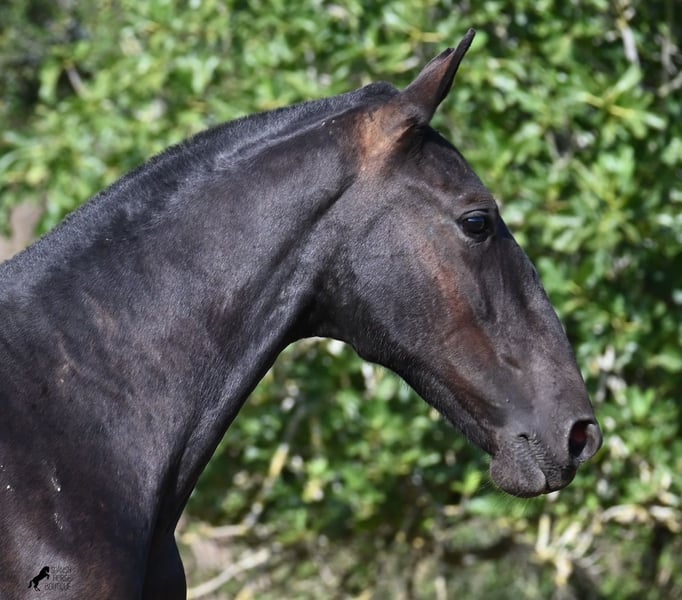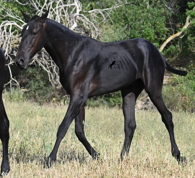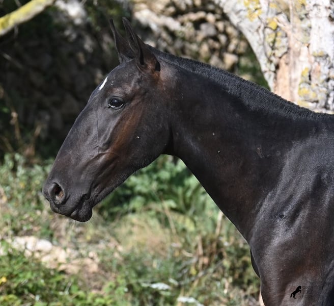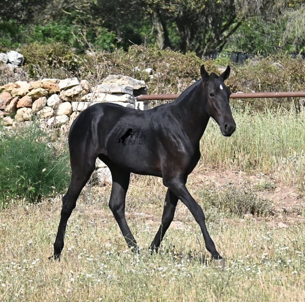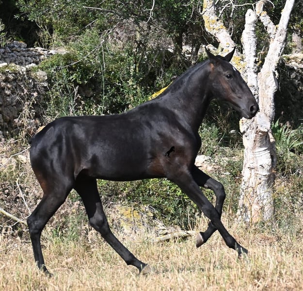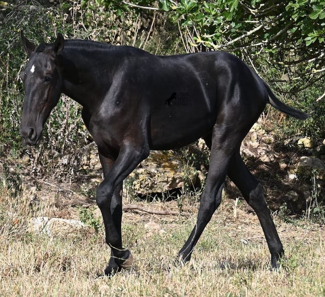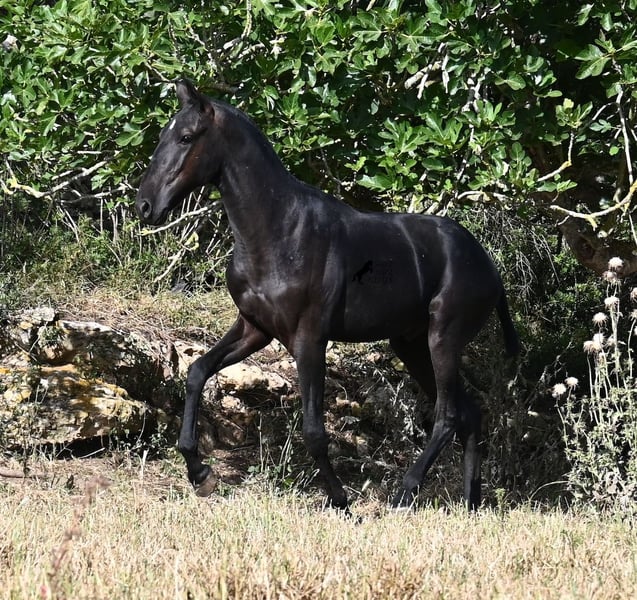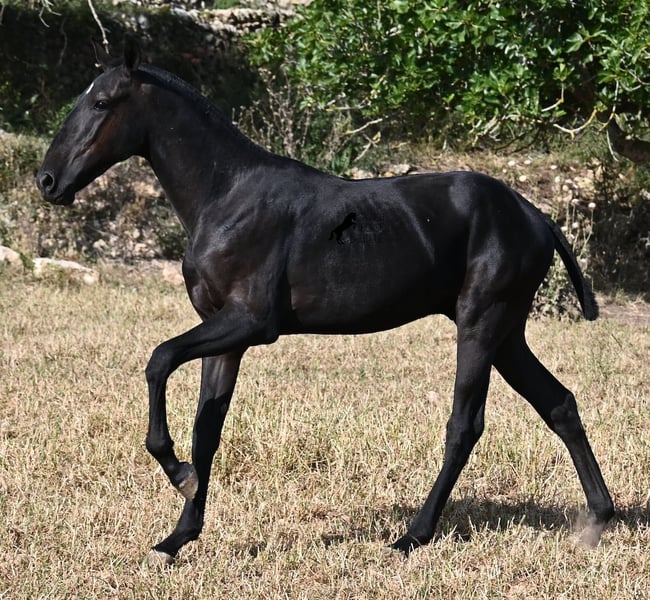 This purebred Menorquin stallion, born in spring 2024, is a truly affectionate and calm treasure! He has no young horse nonsense in his head—on the contrary! He prefers to cuddle, always wants to do everything right, and is incredibly calm for a young horse. If he continues like this, he will definitely become a real family horse! He is allowed to live in a robust environment with company, making him well-socialized and resilient. Not only does he master the basics of foal training with flying colors, but he has also been presented at a breeding show and is familiar with lunging in a halter and being in new places. He comes from old lines of the Menorquin, and his father is over 170 cm tall. His expected final height is around 163 cm, and apart from his sparkling star on his forehead, he is completely black. If you wish to pick him up later, a rearing place can be organized for him. Videos and pedigree are available upon request. His location is Menorca. I would be happy to organize a foal vet check, transport, or your trip if you would like to come see him in person. Details can be found on my page or in conversation. Greetings from Spain!