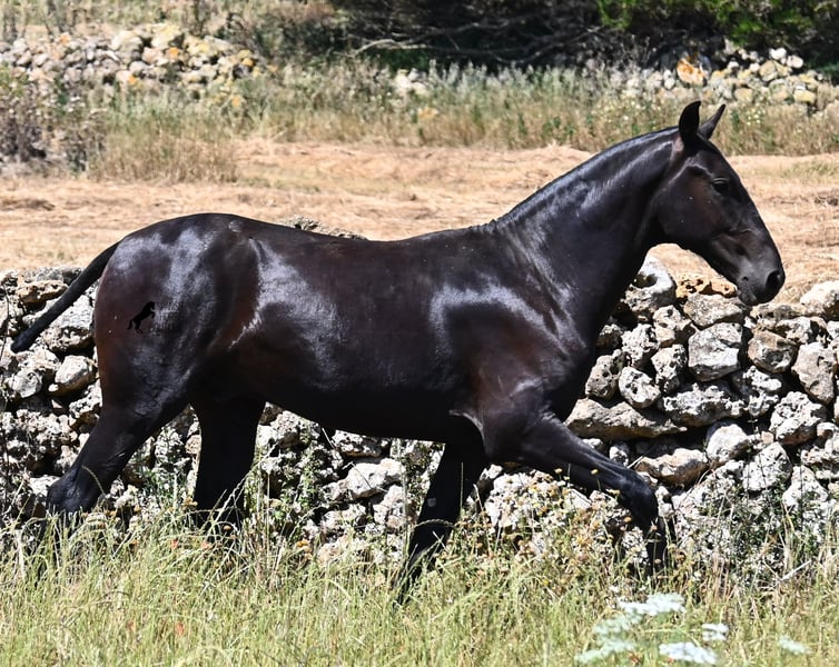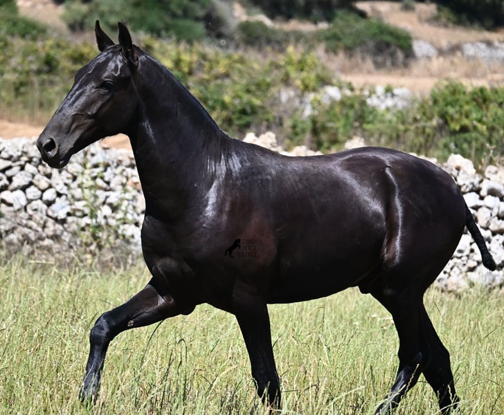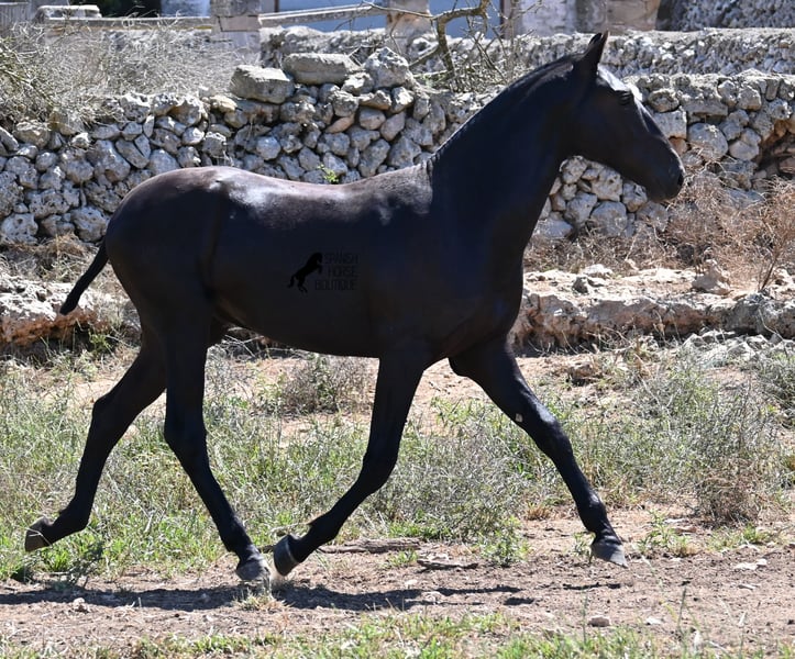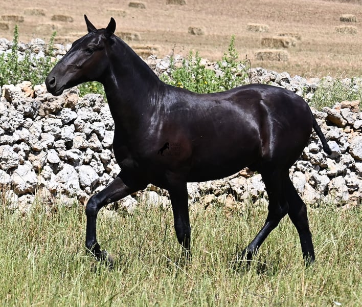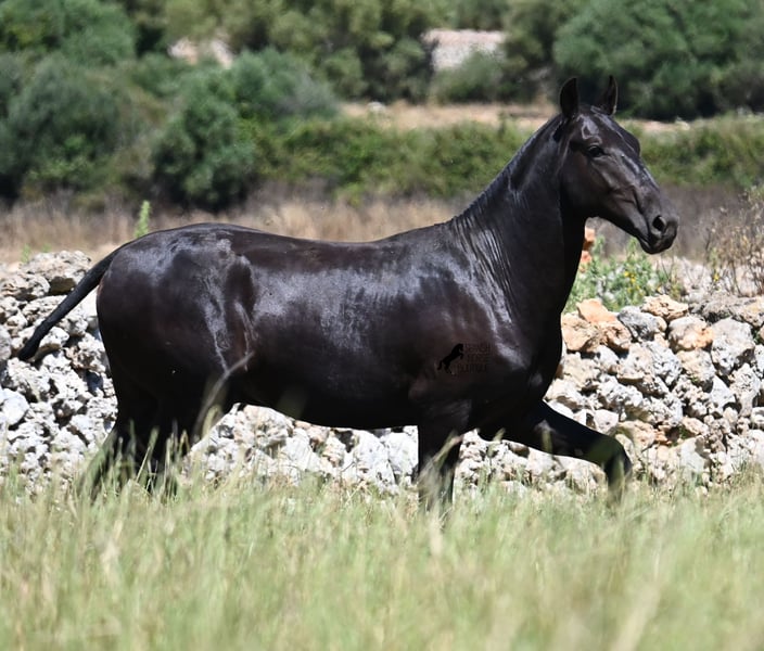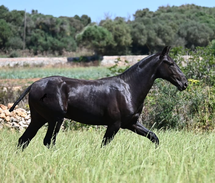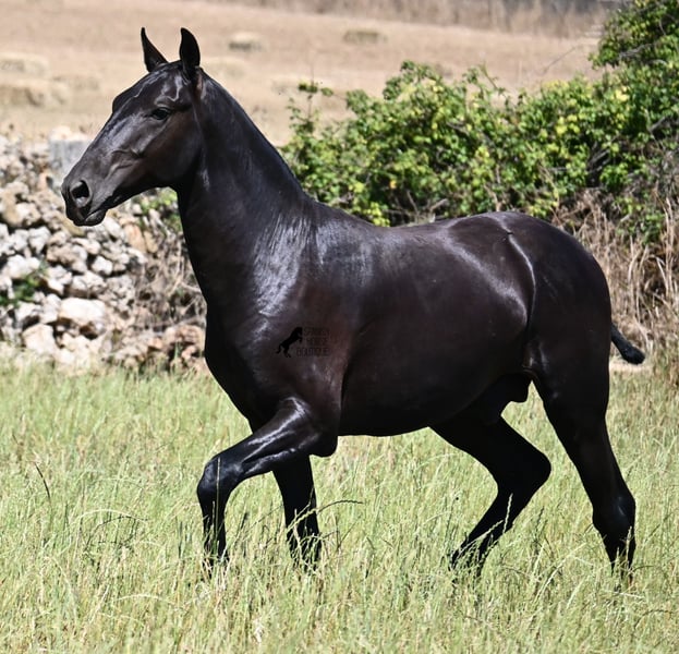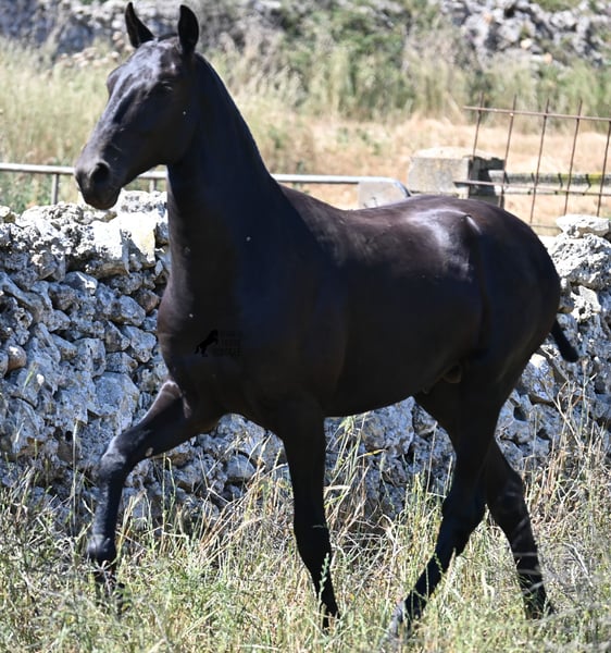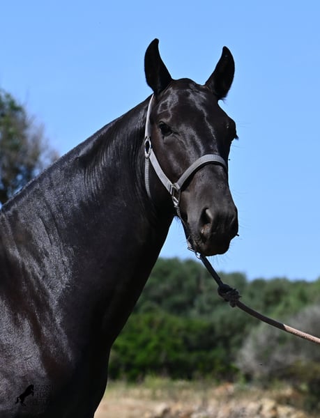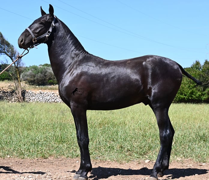 This purebred Menorquin stallion, born in 2024, will leave you in awe. Although he is still so young, his appearance is already breathtaking! Very baroque in type, with no white markings, beautiful crescent-shaped ears, and a presence like a big one... you don't need to use your imagination to know what a magnificent fellow he will become when he is fully grown. He comes from old lines of the Menorquin, known for their endurance, bravery, and versatility, and he undoubtedly possesses all these qualities. He enjoys his young horse life in large pastures with his friend, which has allowed him to be well-socialized. Thanks to the many rocks and hard ground, he has excellent hoof quality and is already sure-footed. In handling, he is very well-behaved; he has also gotten to know the stable and is very friendly and affectionate towards people. Later, he will be interesting both as a riding horse and as a driving horse, as the Menorquin is very versatile! His expected final height is around 165 cm. If you wish to pick him up later, a breeding place can be organized for him. Videos and pedigree are available upon request. His location is Menorca. I would be happy to organize a foal vet check, transport, or even your trip if you wish to come see him in person. Details can be found on my page or in conversation. Greetings from Spain!