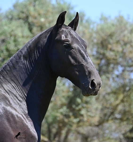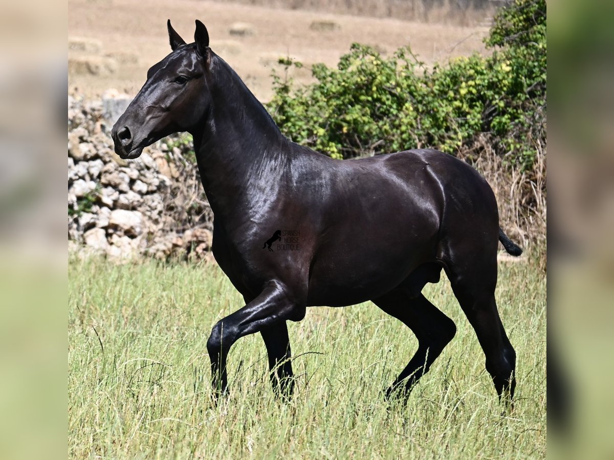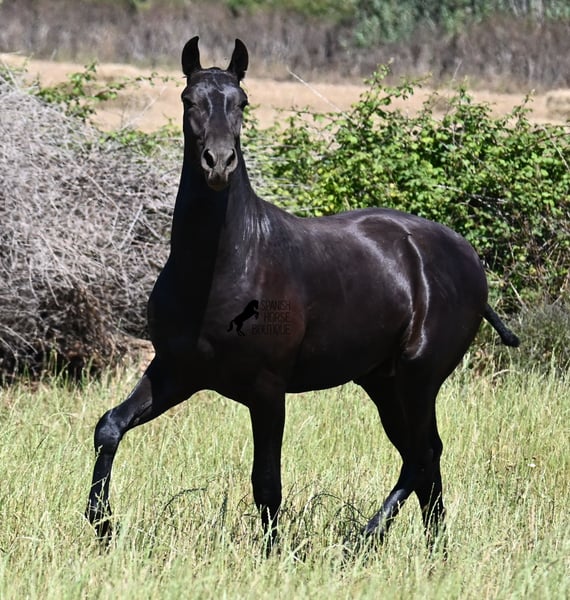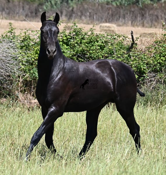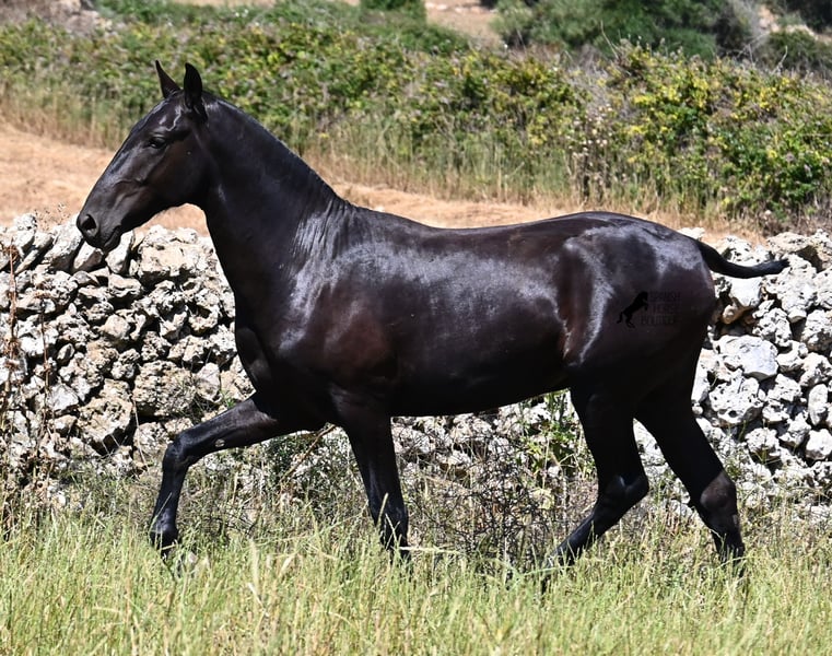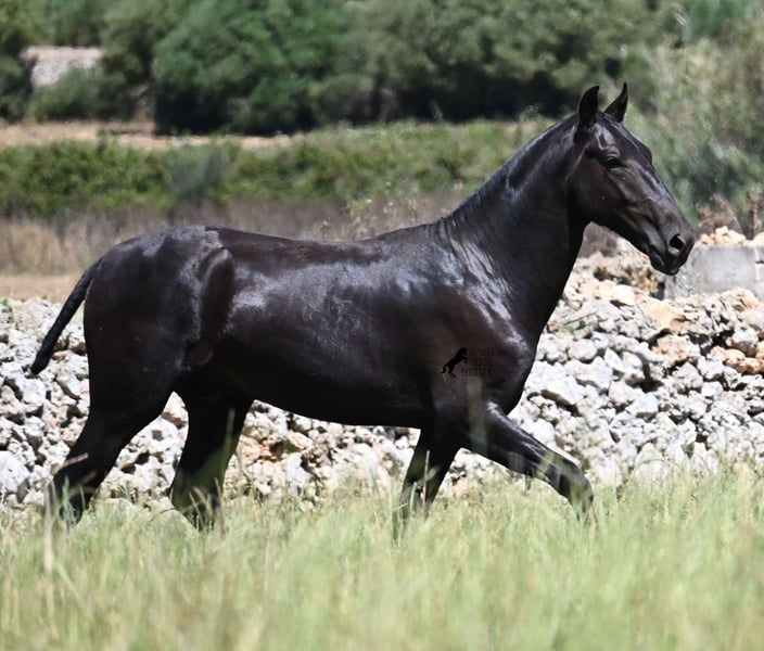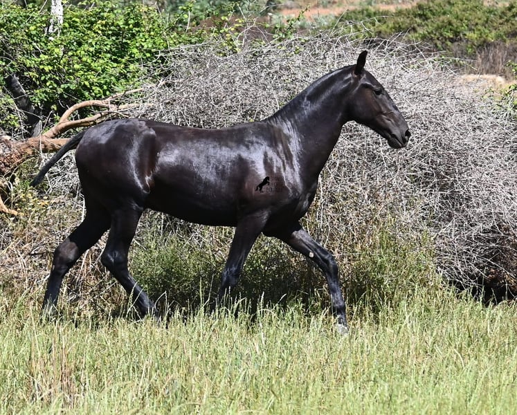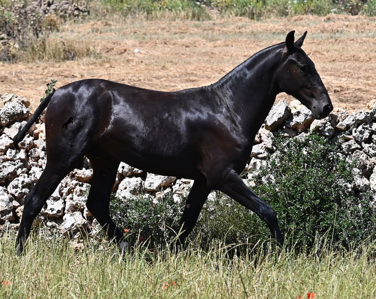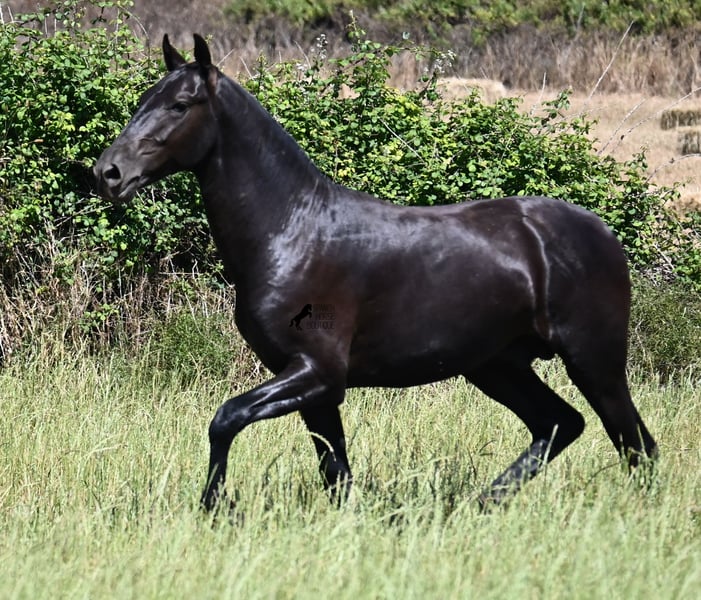This purebred Menorquin stallion, born in 2024, will leave you in awe. Although he is still so young, his appearance is already breathtaking! Very baroque in type, with no white markings, beautiful crescent-shaped ears, and a presence like a big one... you don't need to use your imagination to know what a magnificent fellow he will become when he is fully grown. He comes from old lines of the Menorquin, known for their endurance, bravery, and versatility, and he undoubtedly possesses all these qualities. He enjoys his young horse life in large pastures with his friend, which has allowed him to be well-socialized. Thanks to the many rocks and hard ground, he has excellent hoof quality and is already sure-footed. In handling, he is very well-behaved; he has also gotten to know the stable and is very friendly and affectionate towards people. Later, he will be interesting both as a riding horse and as a driving horse, as the Menorquin is very versatile! His expected final height is around 165 cm. If you wish to pick him up later, a breeding place can be organized for him. Videos and pedigree are available upon request. His location is Menorca. I would be happy to organize a foal vet check, transport, or even your trip if you wish to come see him in person. Details can be found on my page or in conversation. Greetings from Spain!