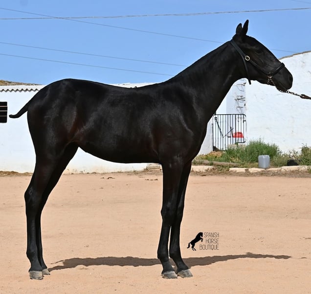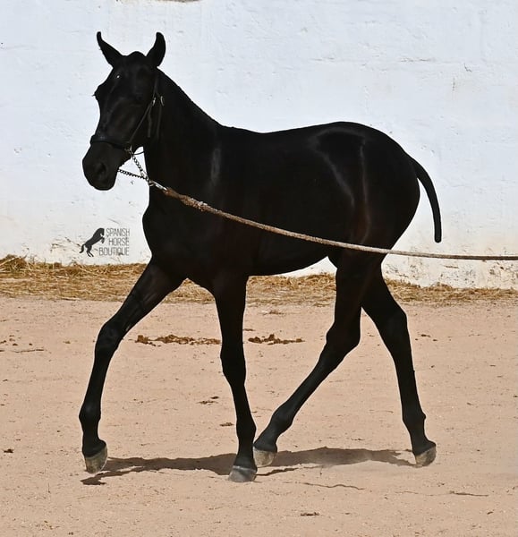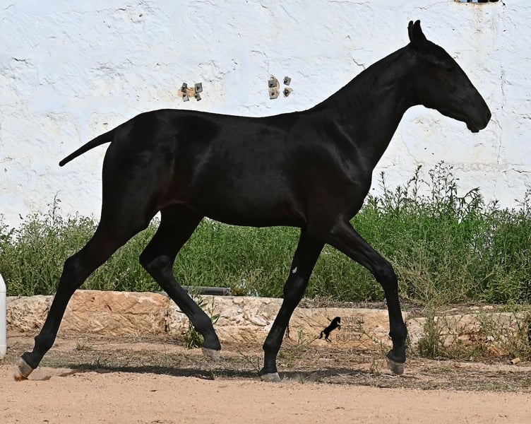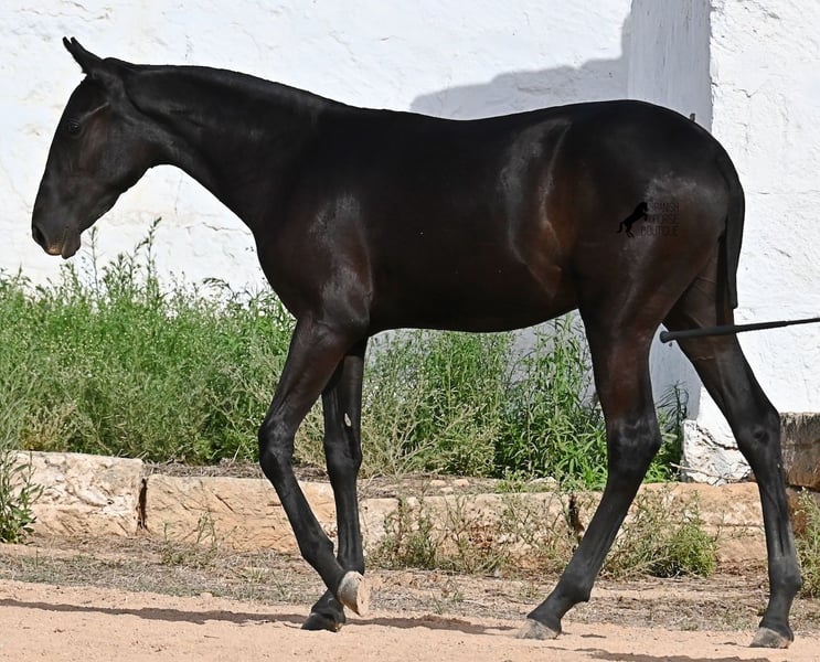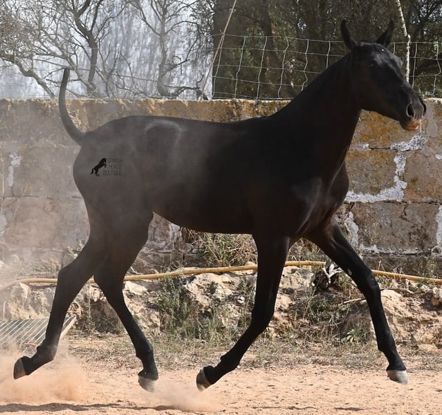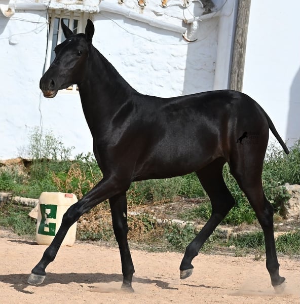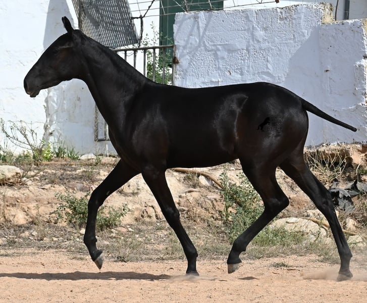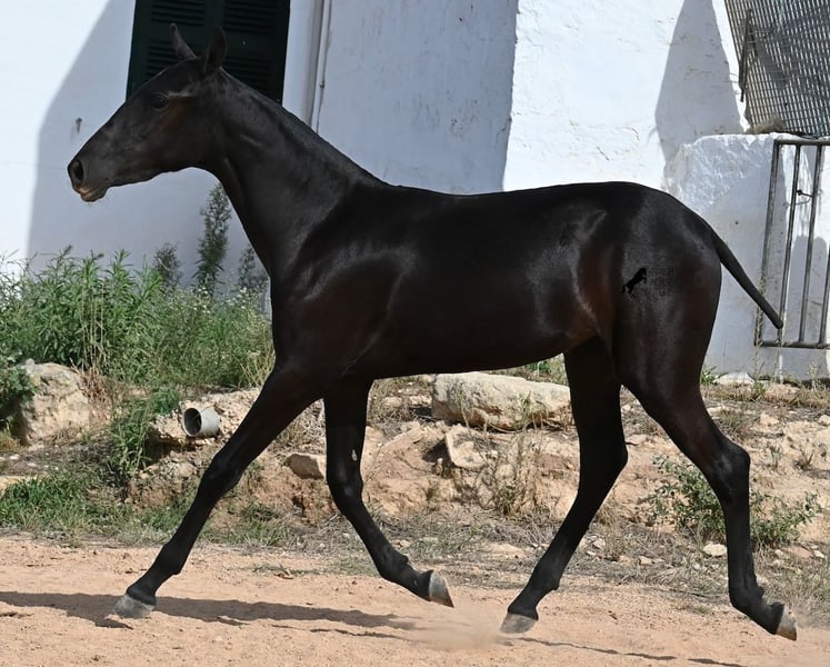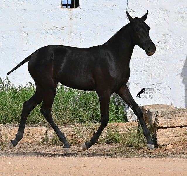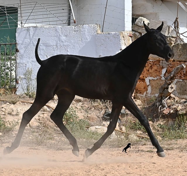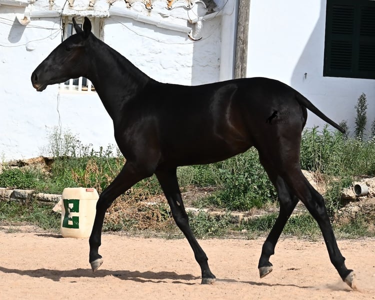 This purebred Menorquin filly, born in early 2025, has an impressive pedigree, as her father was the best stallion of the breed (best sire) and her grandfather is one of only 3 elite stallions of the breed. She has been successfully weaned and is halter-trained, having spent time in very large pastures with a herd of mares of all ages. The terrain is quite hilly, rocky, and very hard, where they are always outside in all weather conditions. This has not only made her very social and robust but has also contributed to her healthy growth, which is evident in her clean legs and good hooves. She now lives in a horse kindergarten, where she is allowed to play and thrive as desired during her upbringing to become a healthy and social horse. She has very correct movements and is very open towards humans. Her character is very calm and cool for a little one at such a tender age. Aside from a small white mark on her forehead, she is completely black, and her gaits are very correct, which will make her a versatile mare later on. Her expected final height will be around 162 cm. Videos and pedigree available upon request. Her location is Menorca. I would be happy to organize a foal vet check, transport, or even your trip if you wish to come and see her in person. Details can be found on my page or discussed in conversation. Greetings from Spain.