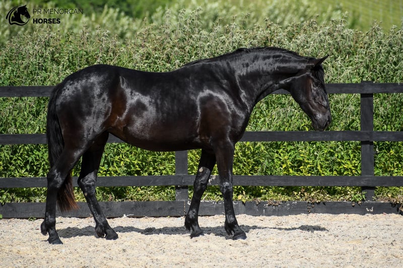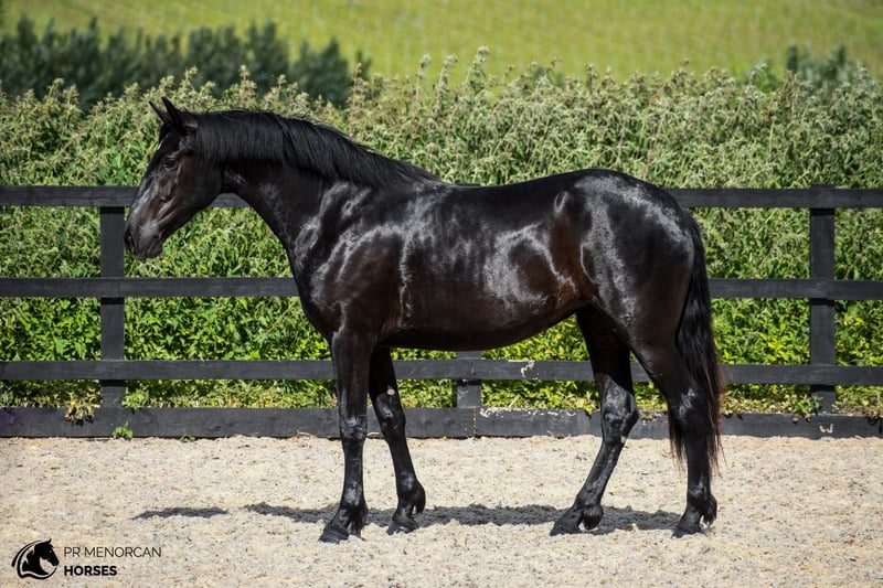 We present a stunning 2022 Purebred Menorcan (PRMe) mare for sale. Standing at 162 cm and still growing, she is an elegant young horse with a completely black coat, marked only by a tiny white star on her forehead, a subtle detail that highlights her unique presence. She is the daughter of one of the only three ELITE-approved PRMe stallions, making her not only visually striking but also genetically exceptional. This rare lineage makes her a highly attractive prospect for future breeding, as well as a charming and reliable partner for leisure riding or groundwork. This mare stands out for her friendly and curious character. She is always the first to greet you in the field, eager for human contact and connection. Her affectionate nature makes her a joy to be around, though she is still learning about space and manners, a common trait at her age that she is gradually improving with time and handling. She is easy to catch, leads calmly, and loads without issue into both trailers and horseboxes. She ties confidently and is well-behaved for the farrier and during bathing. Whether she lives out full-time or spends nights in a stable, she adapts well to her environment and thrives in the company of other horses, be they mares or geldings. While she can sometimes show a touch of impatience, she doesn’t like to be left out of the action, this simply adds to her lively personality. With continued training and the maturity that comes with age, she is sure to grow into a truly exceptional mare. Located in the United Kingdom (UK) International transport and vet checks can be arranged. If you're looking for a PRMe with top bloodlines, presence, and a loving temperament, don’t miss the chance to make her part of your life! Contact us for more info and videos :) Cheers!