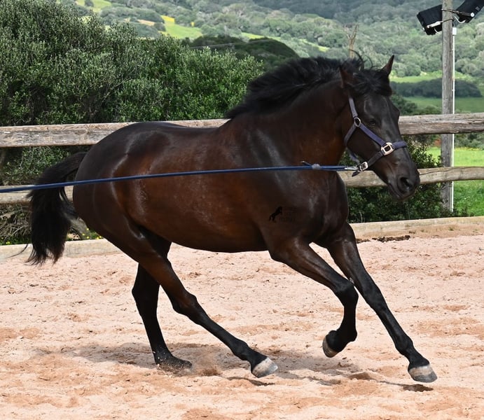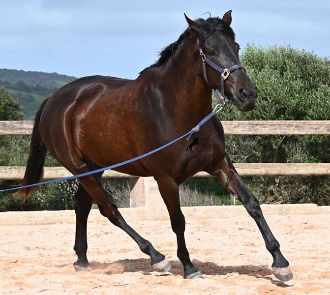 Diese 2021 geborene, reinrassige Menorquinstute, ist mit 165cm nicht nur schon sehr groß für ihr Alter, sie hat auch das entsprechend große Herz! Eine ganz entzückende, liebe Stute, die typisch Menorquin tiefenentspannt ist und nicht lieber sein könnte. Im Umgang ein Herz von einem Pferd und unterm Sattel will sie ihrem Reiter auch immer alles recht machen. Da sie sehr groß ist, wurde ihr etwas mehr Zeit zum Wachsen gegeben, so wurde sie erst im Winter 2024 an den Reiter gewöhnt und wird nun schonend weiter ausgebildet. Dabei ist sie eifrig und absolut brav, als wäre sie seit Jahren schon ein Reitpferd. Ihr Ausbildungsstand entspricht natürlich einem Jungpferd, also manchmal läuft sie noch ein paar Takte einfach der Nase nach, akzeptiert aber den Kontakt immer besser und lernt sich immer mehr zu tragen. Sie geht problemlos barhuf, ist in Robusthaltung in der Herde aufgewachsen und nun seit dem Beginn des Beritts aufgestallt. Sie ist gekört, hat jedoch noch keine Nachzucht, aber wer gerne mal ein Fohlen aus ihr ziehen möchte, hat auch diese Option offen. Auch wenn ganz alte Linien des Menorquin in ihren Adern fließen, wo die Pferde noch nicht so groß und eher barock waren, ist sie sehr sportlich und wird auch noch ein paar Zentimeter wachsen! Es besteht die Option für den Beritt nach englischem Stil oder nach Horsemanship vor Ort! Aktuell steht sie auf Menorca! Videos und Abstammung gerne auf Anfrage. Gerne organisiere ich vor Ort eine AKU, Beritt, Transport oder auch ihre Reise, sollten Sie persönlich zum Anschauen kommen. Details dazu gerne auf meiner Seite oder im Gespräch. Saludos aus Spanien