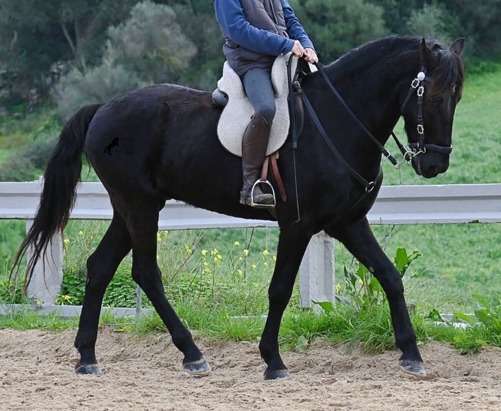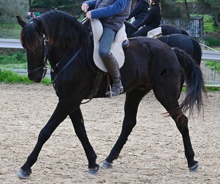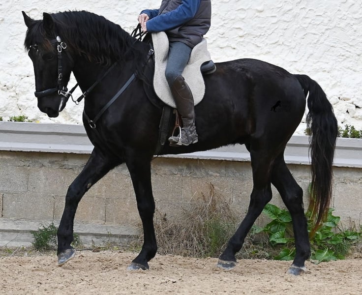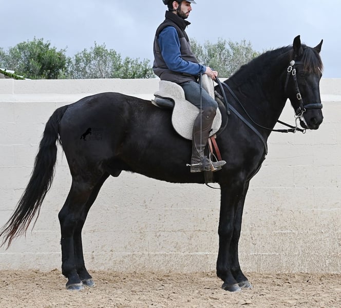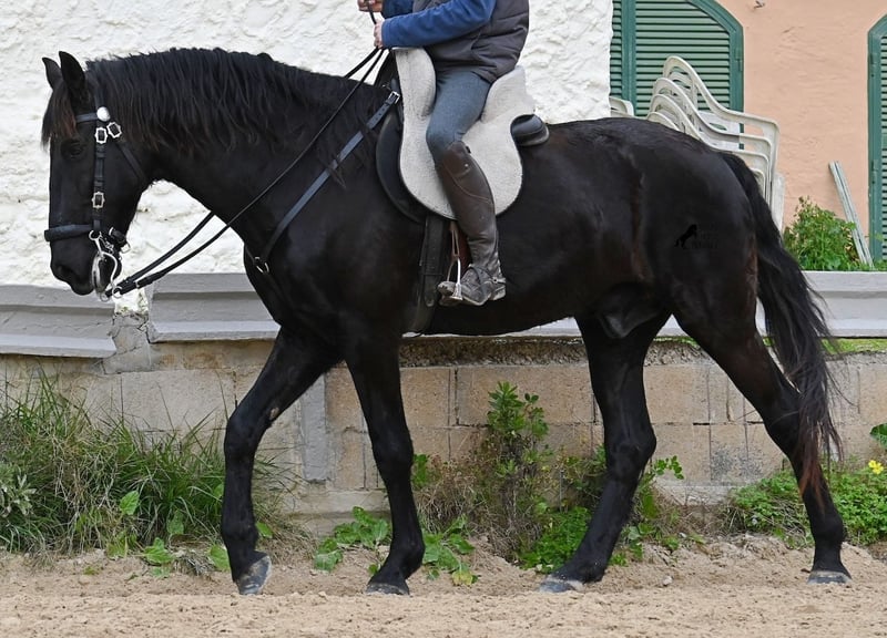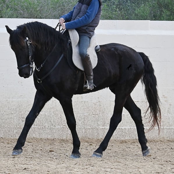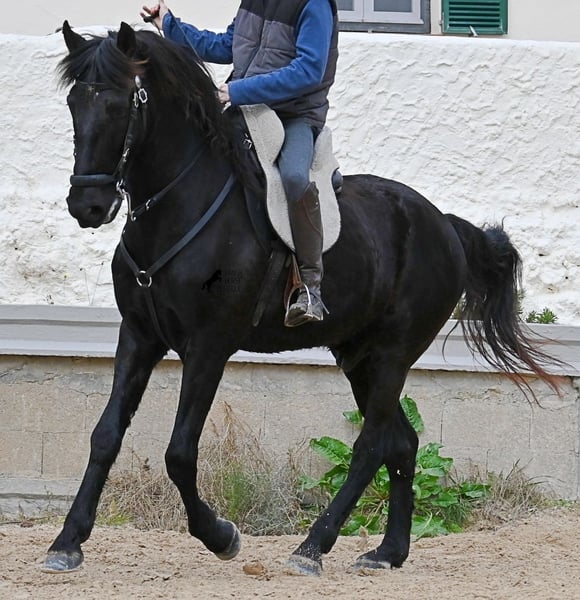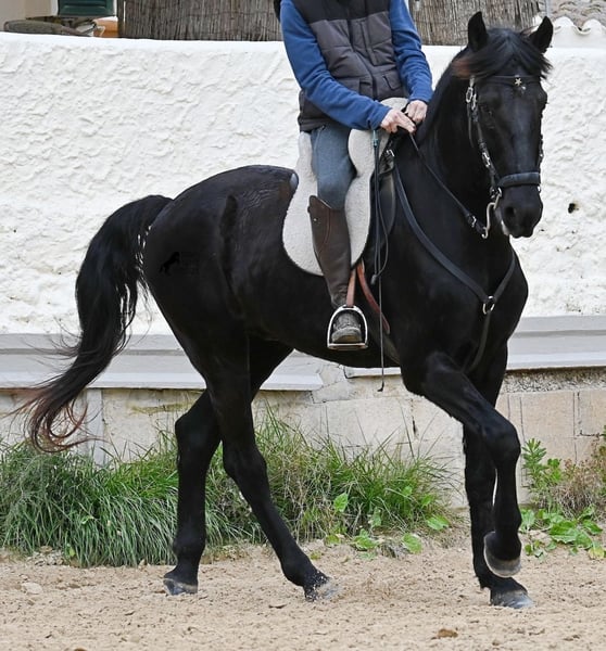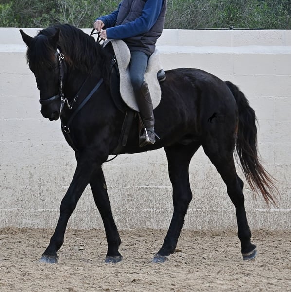 This 2017-born, purebred Menorcan gelding is a very calm and gentle companion. He is currently chemically castrated (injection), but will undergo surgical castration by mid-January 2026, at which point he will be fully gelded and physically a gelding. A new home is sought now, as he will be healed and travel-ready from the end of February. He is kept in 24-hour robust turnout, has always been barefoot, even during fiestas! He is very relaxed in handling and remains attentive to his rider while riding, even with eight other horses nearby. During rides, he often turns his ears toward his rider. His training was completed in the local Doma Menorquina, which is ridden one-handed. He prefers to be out in the terrain, climbing rocky paths, swimming in the sea, and is fearless in traffic—both alone and in groups. Besides his friendly, calm, and gentle nature, his height of 16.1 hh makes him a good size for a family horse. Apart from a small star hidden beneath his forelock and a tiny white marking on the coronet of one hind leg, he is entirely black. Living outdoors, he has a thick winter coat. His location is Menorca. Videos and pedigree available upon request. I can also arrange an on-site pre-purchase exam, training, transport, or your journey if you wish to view him in person. Please see my website or contact me for more details. Greetings from Spain