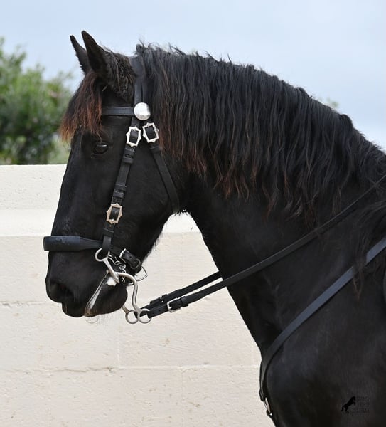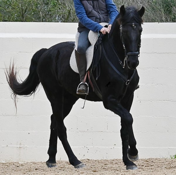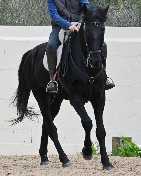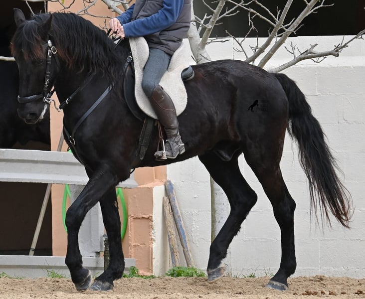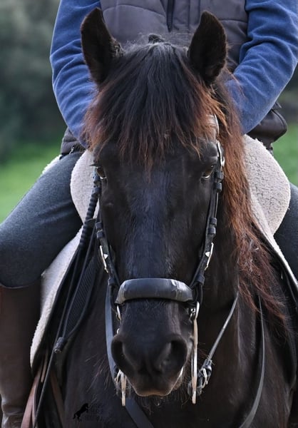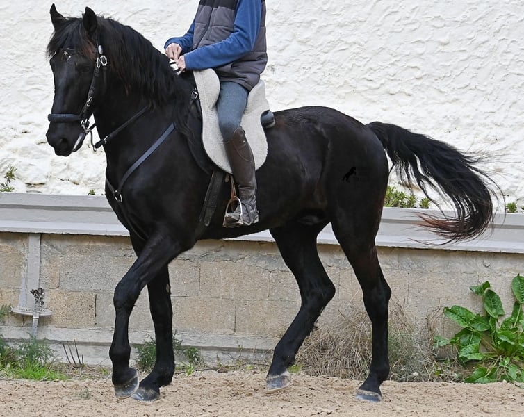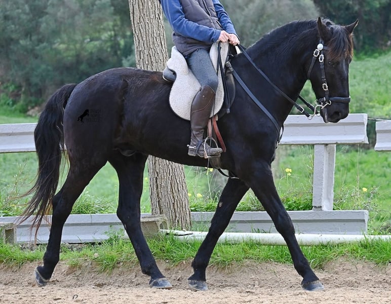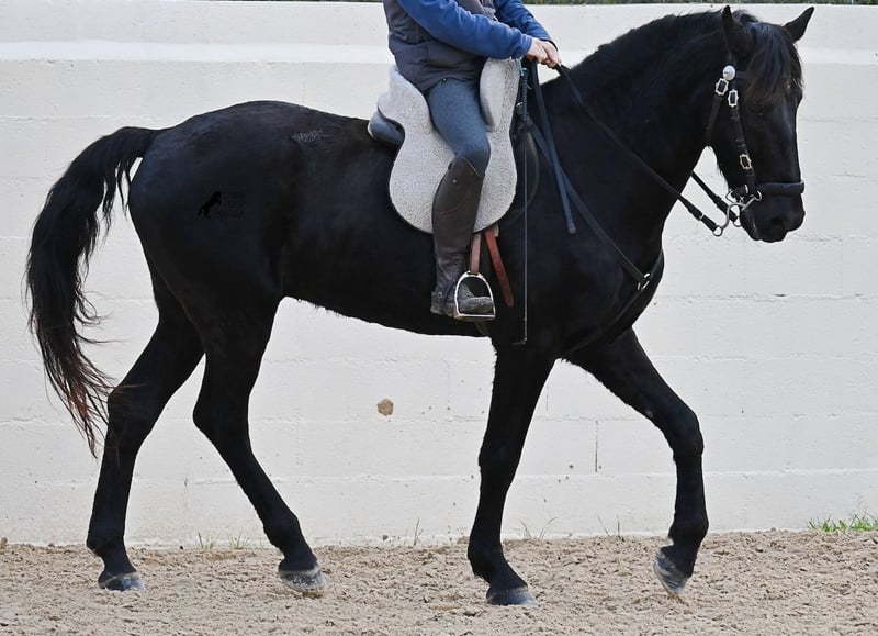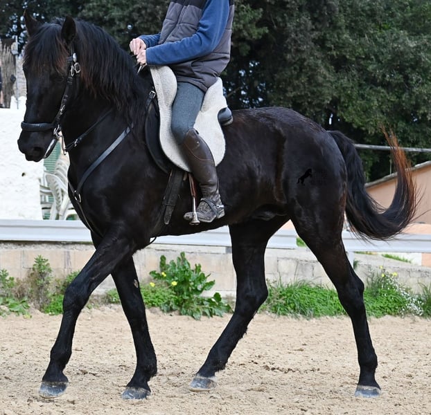This 2017-born, purebred Menorcan gelding is a very calm and gentle companion. He is currently chemically castrated (injection), but will undergo surgical castration by mid-January 2026, at which point he will be fully gelded and physically a gelding. A new home is sought now, as he will be healed and travel-ready from the end of February. He is kept in 24-hour robust turnout, has always been barefoot, even during fiestas! He is very relaxed in handling and remains attentive to his rider while riding, even with eight other horses nearby. During rides, he often turns his ears toward his rider. His training was completed in the local Doma Menorquina, which is ridden one-handed. He prefers to be out in the terrain, climbing rocky paths, swimming in the sea, and is fearless in traffic—both alone and in groups. Besides his friendly, calm, and gentle nature, his height of 16.1 hh makes him a good size for a family horse. Apart from a small star hidden beneath his forelock and a tiny white marking on the coronet of one hind leg, he is entirely black. Living outdoors, he has a thick winter coat. His location is Menorca. Videos and pedigree available upon request. I can also arrange an on-site pre-purchase exam, training, transport, or your journey if you wish to view him in person. Please see my website or contact me for more details. Greetings from Spain