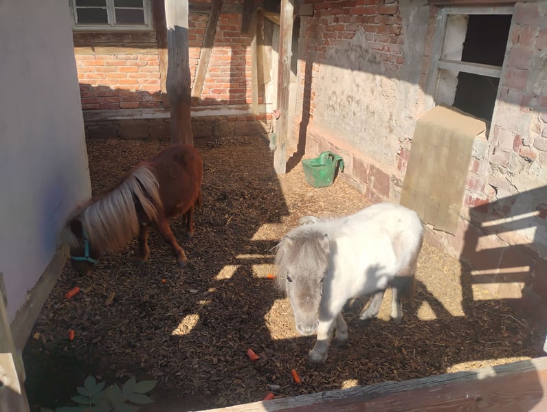 Zum Verkauf stehen meine beiden Minishetty Stuten Bella ist aus April 2023 und eine neugierige und brave Stute, welche sich am Halfter führen lässt und sehr zutraulich ist. Sie ist sehr zierlich und für ihre Rasse etwas klein Nala ist aus März 2024 und hat in Ihren ersten Monaten wenig Kontakt zu Menschen gehabt. Sie ist sehr vorsichtig und es bedarf Arbeit ihr Vertrauen zu gewinnen.. Sie ist aber ebenfalls neugierig und sucht immer wieder den Kontakt. Die beiden verdienen einen Platz, wo man mehr Zeit hat um sich mit Ihnen zu beschäftigen. Dies ist kein Hau Ruck Verkauf und ein gegenseitiges Kennenlernen obligatorisch. Sie werden auch nur an erfahrene Personen abgegeben und nicht an Hobby Tierhalter für Kinderbespaßung. Die beiden werden nur zusammen verkauft Natürlich besitzen die beiden einen Pass und sind gechipt
