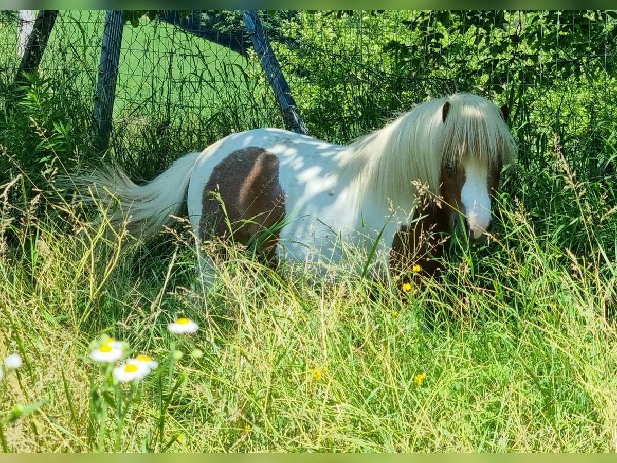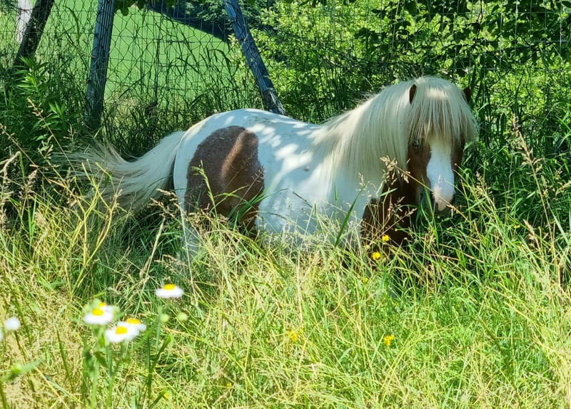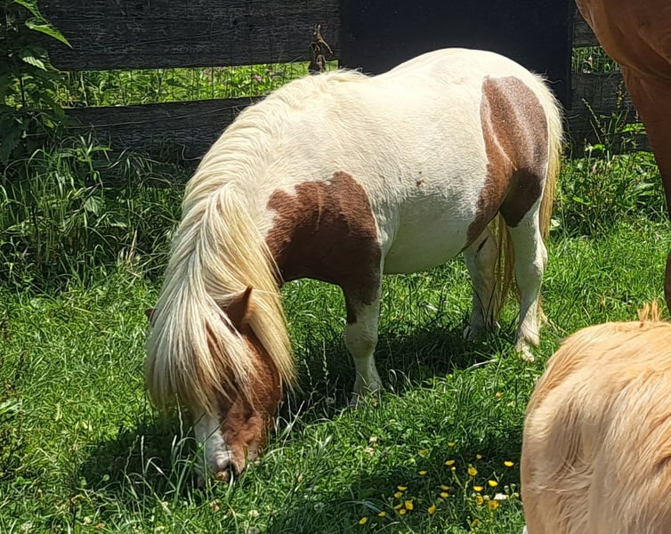 Wunderschöner rein englisch gezogener Mini Shetty Hengst. 6 Jahre. Ca 0,81 cm. Sehr gut erzogen. Hat bei Kindergeburtstagen bereits jeden Blödsinn wie Hindernisslauf, Anmalen,..mitgemacht. Er steigt ganz brav in den Hänger, lässt sich brav anhängen und führen. Sioux kuschelt für sein Leben gerne. Sioux kennt Grosspferde, jede Art von Geflügel und ist Robusthaltung gewohnt. Er kann auch alleine auf der Weide bleiben, wenn die Kumpels arbeiten müssen. Er ist ein wirklich unkompliziertes pony. Sioux hatte mit 1,5 Jahren eine Saumbandverletzung und wird aus diesem Grund günstig verkauft. Mit regelmäßiger hufpflege beeinträchtigt ihn das nicht. Er hat eine wirklich tolle Abstammung. Vater Fairytail Curly Wurly. Englischer Pass. Wir wünschen uns ein liebevolles Zuhause für den kleinen chameur. Preis vhb