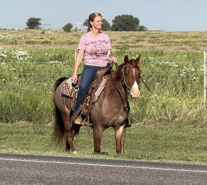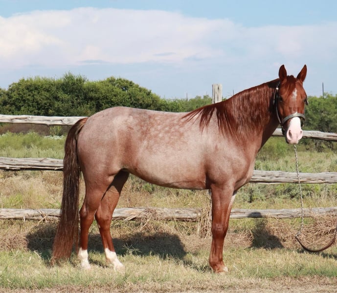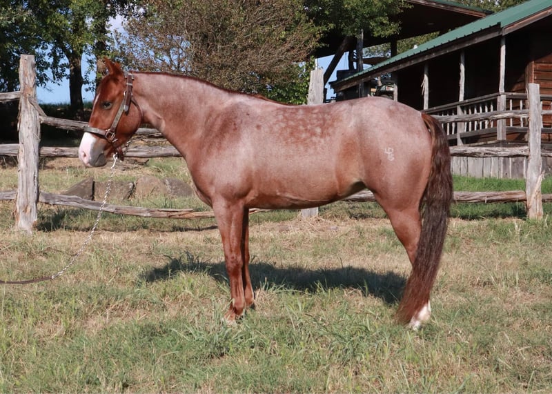 AVAILABLE ON ONLINE HORSE AUCTION AT www DOT MagicHorseAuction DOT com BIDDING OPEN NOW thru TUESDAY | September 30TH! - BUY IT NOW AVAILABLE! *Final price will be determined on auction site* CONSIGNOR CONTACT INFO: 4Ps Horses 940-882-0269 LOCATION: Wichita Falls, TX "Cash’s Red Storm 4Ps Horses is proud to introduce Cash’s Red Storm. Storm is a home raised registered 4 year old red roan Missouri Foxtrotter mare. She will be in the pony registry. She is a daughter of the great Boss’ Midnight Cash and out of our favorite pony mare. Storm has been the favorite for everyone who has ever seen her or been around her. We have had people calling for two years about this mare and now she is finally ready for the public. This stunning mare stands a solid 13.1 and a half hands. She is built like you would want one. She is stout enough to carry a 200lb man for hours and she is kind enough to take care of a 10yr old girl for days on end! This is the perfect horse for anyone who isn’t fond of climbing up on a big horse or struggles to find a rock or tree stump everytime you get off on the trails. This little mare will walk with a big horse and also has the laid back personality to just chill with your quarter horse friends. Red Storm is safe around traffic, atvs, bicycles and wildlife. We have used her on the trails, checking cattle daily, rode her down the highway and hauled her to a horse show just for fun! She was the the talk of the town! If your looking for something that turns every head on or off the trails and will be a fun mount for the whole family…here she is. This mare is truly one of a kind!! After talking to all the other breeders in the MFTHBA we have came to the conclusion this mare is the only one. She is the only red roan mare that will mature under 14h. And her gait is so smooth with a great canter and easily picks up both leads. She has been introduce to the poles and barrels and she loves it! We have also sorted cattle on her. As you will see in the video she is ready for the novice or experienced rider and will be a great step up horse. She will ride to the persons ability, and that’s what we love about her so much. Horses like this are hard to find. Thank you for your time and please contact us to come ride her or for any additional questions. 4Ps Horses Jeff 940-882-0269 Kristy 361-960-8301