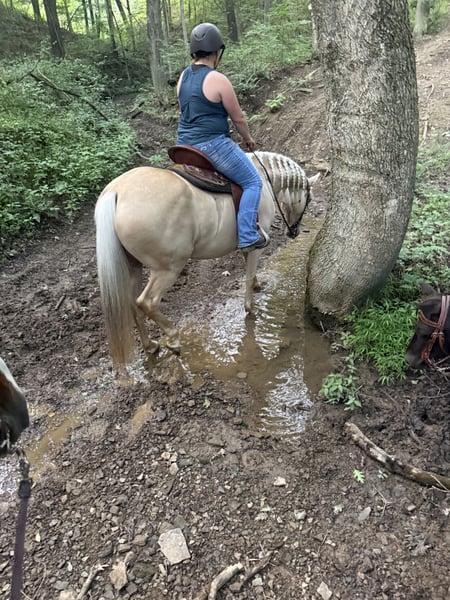 Registered Missouri Foxtrotter. Heart of gold. Calm disposition. Not spooky. Road safe. Loads and trailers nicely. Is boss mare when grain is involved. Stands nice for farrier. Barefoot. UTD on shots, dewormer and teeth. She has mostly been used for trail riding and gaming fun shows. She is a lot of fun on the trail. She will carry a flag. My 7 yr old has ridden her english over cross rails.