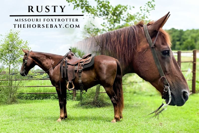 Meet Rusty, a 10-year-old, 15hh, chestnut Missouri Fox Trotter gelding. This sweet boy is broke to ride for the whole family and has been used primarily as a trail horse. Rusty is sure-footed, calm, and confident out on the trail, rides out alone or in a group with no issues. Rusty has an amazing smooth gait and a rocking chair canter. Rusty is trail-safe, dependable, and always easy to catch, load, tie, and handle. Rusty has been on several overnight camping trips all over Missouri and Arkansas. Rusty has Great ground manners and is ready to hit the trails with his next rider.
