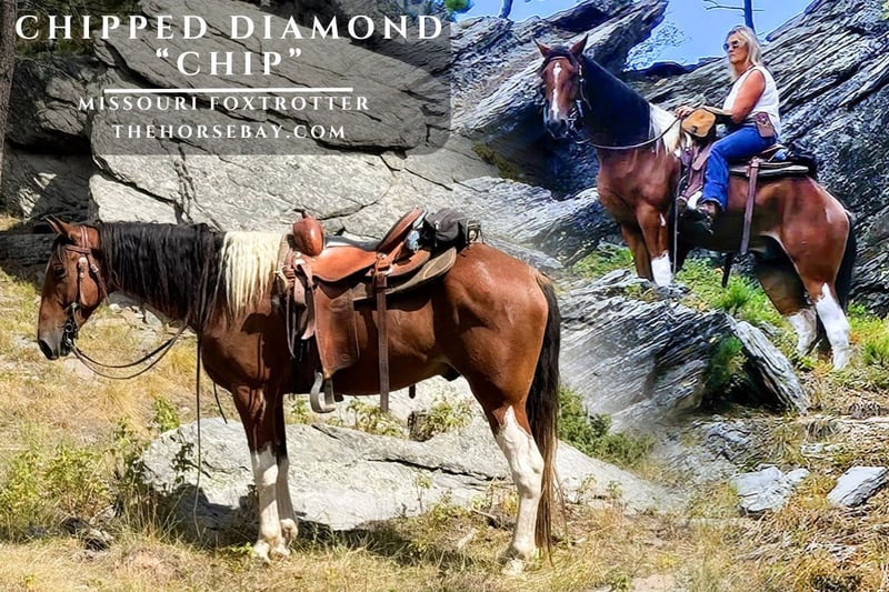 Chip is a stunning 4-year-old registered Missouri Fox Trotter gelding with a beautiful bay-and-white coat. Standing at a solid 15 hands, he has the size and build to be a comfortable mount for any rider. Don’t let his age fool you; Chip has been extensively trail-riden and camped all over, handling diverse terrain and situations with a maturity beyond his years. This handsome gelding is sure-footed and confident, whether crossing water, navigating rocky ground, or traversing new trails. He has a naturally smooth, ground-covering foxtrot that makes all-day trail rides a pleasure. Chip is equally well-behaved at camp, standing tied quietly and getting along well with other horses. His gentle disposition and extensive trail experience make him a perfect partner for someone looking for a dependable, naturally gaited, and eye-catching horse to enjoy for years to come chip neck reins very well backs up and side passes chip has a very smooth running walk and also a rocking chair canter chip is gentle as they come will be the easiest to catch in the pasture he’s a true once in a life time trail horse for anyone wanting to enjoy the trails no matter how rough they are