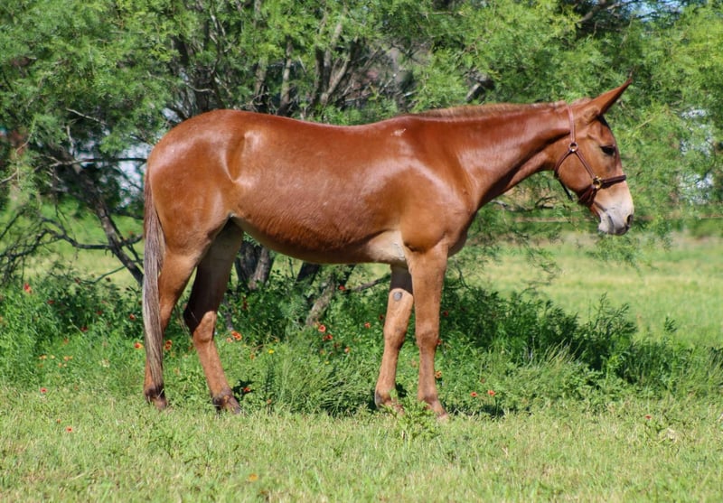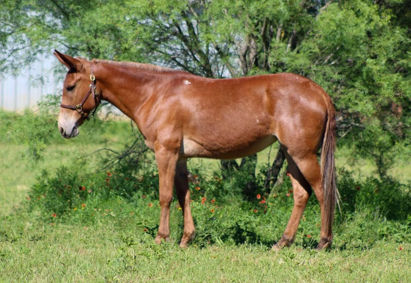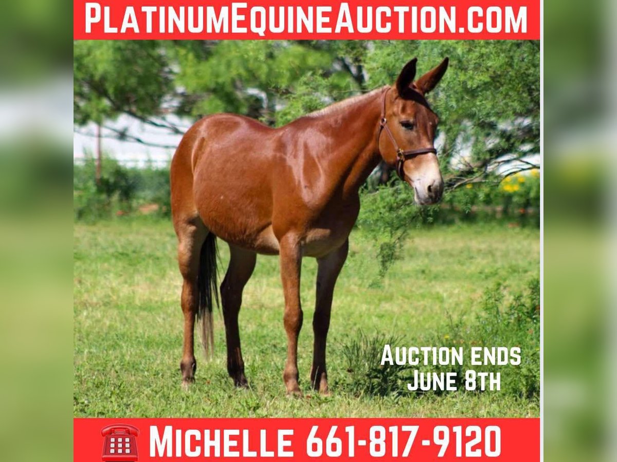ONLINE AUCTION Place your bids at www.PlatinumEquineAuction.com Starting Bid $3500 Auction ends June 8th, 2025 Need a new saddle? Check out White Rock Saddles on our website or Facebook! Meet Cherry Bomb, the ultimate 8-year-old molly mule who’s as sweet as she sounds! Standing at a perfect 15 hands tall, this little lady is a true gem. With her vibrant red coat, she’s definitely the bomb.com! Cherry Bomb has dabbled in just about everything you can think of and has been exposed to all sorts of adventures. She’s spent countless hours working on the ranch, tackling all the chores with ease. Always low-headed and relaxed, she travels on a loose rein, making her a “point and go” kind of mule. Whether it’s a week-long camping trip or a hunting excursion, Cherry Bomb has proven herself time and again—she’s even helped pack deer out of the backcountry! With many miles of trails under her hooves, Cherry Bomb is as sure-footed as they come. She confidently navigates steep rocky paths, crosses logs and bridges, and doesn’t hesitate to splash through creeks and rivers of all sizes. Plus, she’s great at ponying horses and colts, whether it’s out on the trail, in the pasture, or just a quick exercise session in the arena. Cherry Bomb has been desensitized to a variety of sights and sounds—she’s had guns shot off around her, carries flags, and even packs tarps without breaking a sweat. In the arena, she shines with a smooth jog and lope, and she’s responsive to leg cues and neck reining. While she’s not a speed demon, her laid-back attitude makes her a joy to ride. This girl has even tackled traffic on the highway and handled her first visit to the famous Fort Worth Stockyards like a pro! She walked confidently down the bustling Exchange Avenue, unfazed by the crowds, loud music, horse-drawn carriages, and even the iconic longhorn cattle drive. Cherry Bomb has also shown off her skills on trail courses, maneuvering over tires, logs, bridges, and various obstacles with grace. Always eager to please, Cherry Bomb meets you at the gate with a friendly attitude, ready to work. She’s great with her ears, easy to tack up and bridle, loads and unloads from the trailer like a champ, stands patiently for the farrier, and enjoys bath time. She ties well and is just an all-around wonderful mule! We absolutely adore Cherry Bomb and know her new owners will love her just as much as we do. Check out her video to see all the amazing things she can do—she’s truly one of a kind! We are open to anyone interested in her to schedule a time to come see her or if you can’t make it schedule a FaceTime showing to see her. If you need help with transport don’t hesitate to ask we have a list of reputable haulers that can get her safely to your doorstep WORLD WIDE including, Alaska , Mexico, Hawaii, Canada and anywhere in between. For more info contact M $ Performance Horses Michelle 661-817-9120. ONLINE AUCTION Place your bids at www.PlatinumEquineAuction.com Starting Bid $3500 Auction ends June 8th, 2025 Need a new saddle? Check out White Rock Saddles on our website or Facebook!