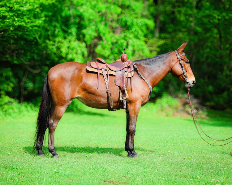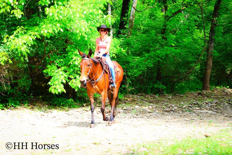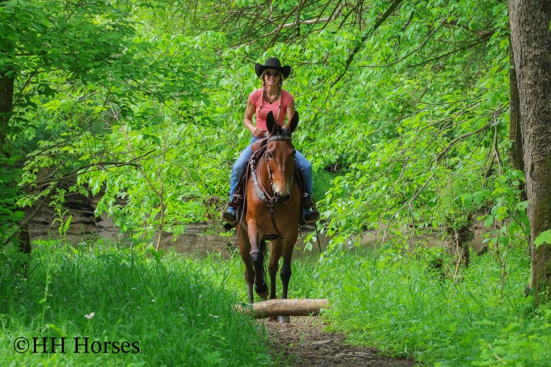 ONLINE AUCTION Place your bids at www.PlatinumEquineAuction.com Starting Bid $3500 Auction ends June 1st, 2025 Need a new saddle? Check out White Rock Saddles on our website or Facebook! This is “JADA”, one exceptionally well trained, seasoned, and experienced BAY MOLLY MULE that has been shown in reining, ranch pleasure, trail classes, and halter. This mule is extremely well broke, gentle, honest, and safe. She has been trail ridden all over the mountains by a lady in her late 60’s. She has been a one owner mule and been well taken care of. She has won many blue ribbons in many different classes. She has been ridden English and Western. This mule will sit down and turnaround, slide stop, side pass, ride around collected and correct, and stand to mount, tack, and groom. She has impeccable ground manners, loads, bathes, and hauls with no issues. She rides out alone, crosses water, handles rocky steep terrain, and will go anywhere you point her. She is traffic safe, not spooky, and so much fun to ride. She is 10 years old and stands 16.1 hands tall. If you want a mule that any level rider can get on and get along with, here she is. She will make a beginner look like a professional. She is quiet, safe, patient, kind, and honest. Contact HH Horses Erin 304-238-4155 with any questions, to make a Buy It Now Offer or to set up a time to come see her. ONLINE AUCTION Place your bids at www.PlatinumEquineAuction.com Starting Bid $3500 Auction ends June 1st, 2025 Need a new saddle? Check out White Rock Saddles on our website or Facebook!
