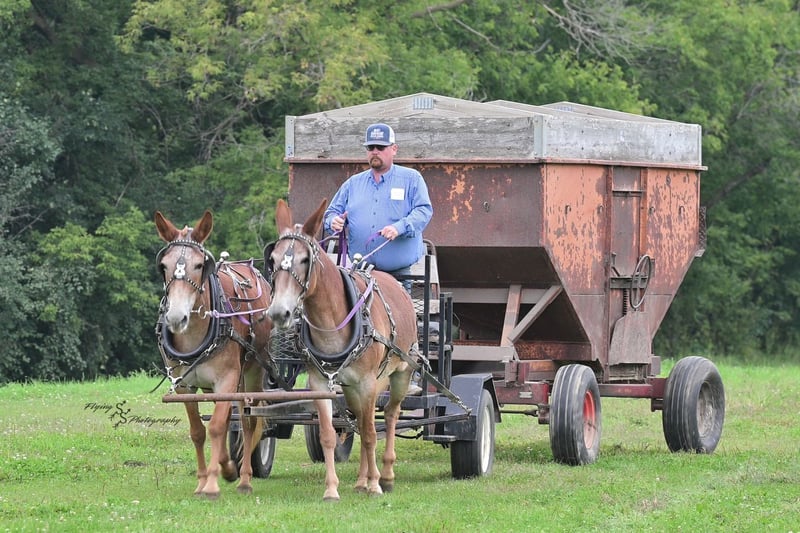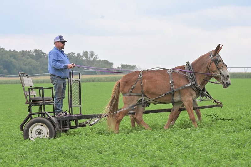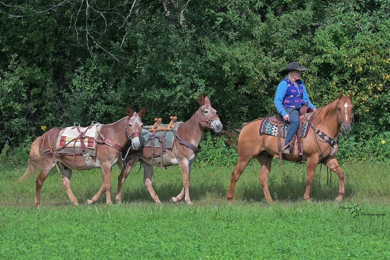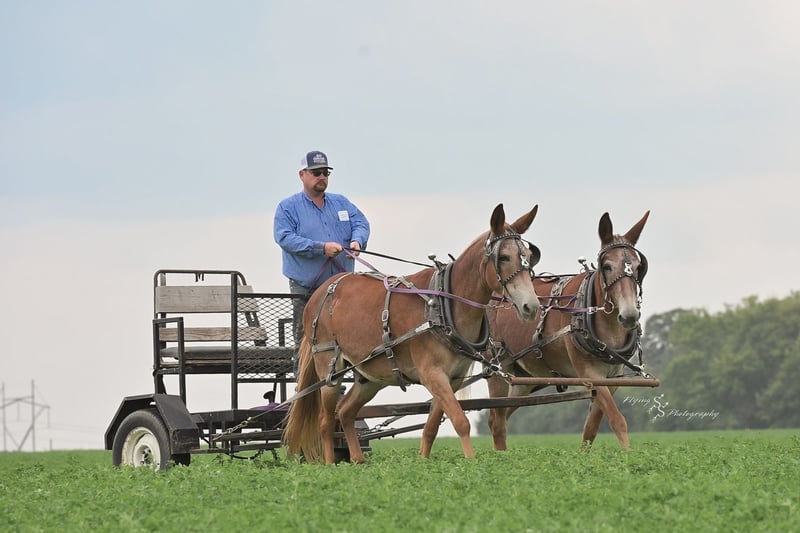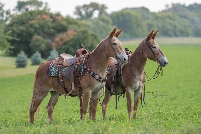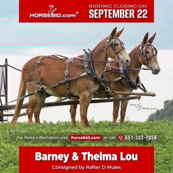🍁𝒕𝒉𝒆 𝐅𝐀𝐋𝐋 𝑺𝒑𝒆𝒄𝒕𝒂𝒄𝒖𝒍𝒂𝒓🍁 Happening now thru MONDAY | SEPTEMBER 22nd - Available EXCLUSIVELY on HorseBid's website! For more details and to register visit: www.Horsebid.com CONSIGNOR CONTACT: Rafter D Mules 651-303-7056 LOCATION: Hastings, MN BREED: Mule REGISTERED: No COLOR: Blonde HEIGHT: 14.2 John - 14.3 Molly AGE: 13 GENDER: John Mule Have you spent your life dreaming of having your own team of mules to take you, your friends, and your family on wagon rides through the scenic trails of the countryside? Meet Barney and Thelma Lou! We are proud to offer this team that is beginner friendly, safe enough to trust with your family, and as honest as the day is long. While they are confident hitched side by side under harness, they are also broke to ride and pack! Barney and Thelma Lou are a well-trained team that can be easily hitched by one person. They have been used on wagon trains, working around the farm, and have been hitched to all types of farm equipment including grain wagons. They ride well together and also pack well together. This handsome couple are in the prime of their life and would make a great addition to anyone's farm as well as family. Barney and Thelma Lou are both easy to catch, not ear shy, and are both used to having their feet handled. Whether driving down the highway, gravel road, or through the fields, this team is easy to handle and so much fun to work with. Thelma Lou has a mass on her lower left side. It has been examined by a veterinarian, and they stated that it was comparable to a wart and was not of any concern. We absolutely love this team and know that you will too! If you have any questions about Barney and Thelma Lou or would like to meet them prior to the auction ending, please contact Dillon at Rafter D Mules 651-303-7056.