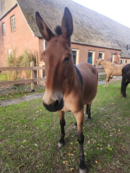A Mule with a Big Heart Is Looking for His Forever Home 💕💕 Bonschi, soon 14 years old, approximately 15.2 hh 💕💕 🩷🩷 Bonschi is an absolute cuddle bug. He is very tolerant of being touched everywhere, loves closeness, and truly enjoys shared moments. He is present, clear-minded, and attentive — a horse you don’t have "on the side," but one you experience consciously. Those who get to know him quickly realize: he has a lot of heart and a strong personality. 🩷🩷 He will soon turn 14, is very clear, unspoiled, and motivated. He was ridden later in life and performed very well. He brings strength, a commanding presence, and a desire to be taken seriously. He wants to be part of the conversation, understood, and to work on equal footing — not just blindly performing but truly engaging in partnership. ☝️ In his social structure, he is confident: he gets along very well with my gelding and higher-ranking horses. With very small or subordinate animals, he may chase or show some stallion-like behavior — this should be considered in his new home. 👉 I have mostly worked with him from the ground so far. It’s clear how much he appreciates having space. He doesn’t like to be pushed, but in groundwork, he can relax wonderfully and work with you. He wants to do something, learn, and above all, build a genuine connection with “his” person. 👉 He leads effortlessly and trusts his handler completely. 💕 He was intended as a life partner for my mule mare. But sometimes, things just don’t work out as planned. 💕💕 This mule has too much heart for a half-hearted home. 💕💕 He’s not looking for just a “place,” but for a 6-star-plus home with someone who has time, feeling, and the desire to continue his training. Only in an outdoor turnout. Priority goes to the well-being of the horse — only in the best, horse- or mule-experienced hands. An overnight stay here can be arranged, and I know reliable transport companies that can bring him calmly and stress-free to his new home. He stands very calmly in the trailer and travels without issues.