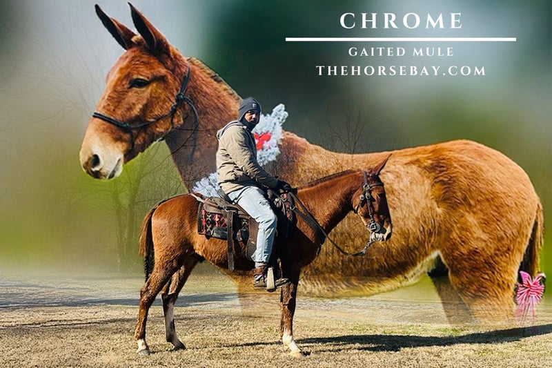 Chrome is a beautiful red sorrel gaited John mule with three white stockings—he’s got all the right color and eye appeal. At just 5 years old, standing at 14.2 he already shows an exceptional mind and temperament. He is calm, willing, laid-back, and slow-going, making him an ideal mule for the whole family. Chrome is sure-footed, quiet, and steady on the trail. He has been trail ridden extensively throughout Alabama, Mississippi, Kentucky, and Tennessee, and he’ll go anywhere you point him. He crosses creeks and logs with confidence and handles rough terrain like a seasoned mount. He has been ridden in traffic, gunfire from a .22 while coon and squirrel hunting, and has been packed off of. Chrome has also been around cattle and gets along well with other animals. If you’re looking for a trustworthy, gentle, and well-started young mule with plenty of experience and a great mind, Chrome is the kind you don’t find every day.