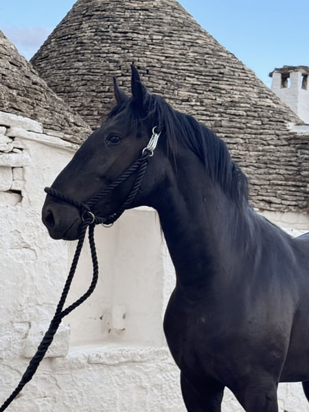 Tancredi embodies the original lineage of this impressive breed and possesses everything one could wish for in a true Baroque horse: a strong build, elegant appearance, and an honest, clear gaze. We estimate his final height to be around 163 cm – making him ideal for riders who appreciate size and presence. Tancredi was raised in a herd environment, knows the basics of foal education, and always presents himself as friendly, attentive, and people-oriented. Castration is possible on-site upon request. X-ray images are available and can be viewed with serious interest. We also plan everything else for you – clinical purchase examination, processing of the purchase contract, transport to your home stable, etc. Cavallo Murgese.de – on behalf of and in collaboration with the Italian Murgese Association A.N.A.M.F.