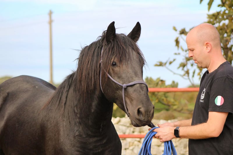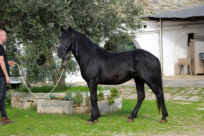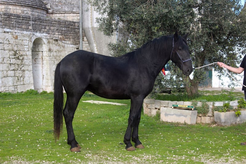 T.F. Proust Tequila An outgoing, very gentle on the hand, and affectionately cheeky – these words best describe Tequila. In the round pen, Tequila pays close attention to his handler and responds to the slightest changes in body language. He is very affectionate towards people, always ready for a little joke ;-). Tequila grew up with some buddies in the herd of the breeder from whom we are now able to offer him. He is familiar with life on a masseria, which means: dogs, guard geese, cows, tractors, and more dogs. He has professionally learned the basics of young horse training and is now looking forward to the next steps in his education with you. Currently, Tequila is not yet castrated but can be done upon request (included in the price) by the breeder. Born in 2023, his estimated final height is around 16.1 hh. If you would like to know more about Tequila – we look forward to your message. X-rays are available and, upon serious interest, can of course be viewed. We will also organize everything else for you – clinical pre-purchase examination, handling of the sales contract, transportation to your home stable, and more. Cavallo Murgese.de – on behalf of and in cooperation with the Italian Murgese Association A.N.A.M.F.