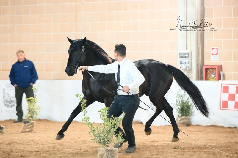I cost of castration is already included in the price. Santiago belongs to the lighter, yet still visually baroque type of Murgesen. He is currently 155 cm tall, and we estimate his final height to be around 158 cm. The young horse has a good foundation, with a nice topline and a comfortable, well-set neck. Overall, he is a typy representative. He is also characterized by a very sweet temperament—open, friendly, and curious. The young stallion was born and raised in the Vallenza breeding area. He was kept outdoors according to breed standards until he was two years old, when he moved into stables and was gradually accustomed to humans. Santiago knows all the basics he should at his age. The young horse’s ABC is no longer unfamiliar, and he consistently shows willingness to learn and a positive attitude during work in the round pen. Would you like to meet Santiago in person? He is currently still in his homeland in Apulia—we are happy to arrange a visit for you. X-ray images are available, and upon request, he can be castrated directly at the breeder’s facility. A clinical health check (AKU) can also be organized. We will also take care of everything else for you—castration (included in the price), handling of the purchase contract, transportation to your home stable, and more. We look forward to hearing from you! Additional photos and a video of him in motion are available upon request. – on behalf of the Italian Murgesen Association A.N.A.M.F.