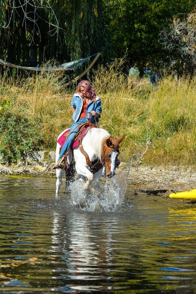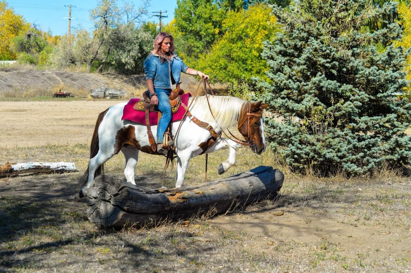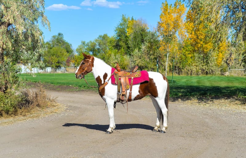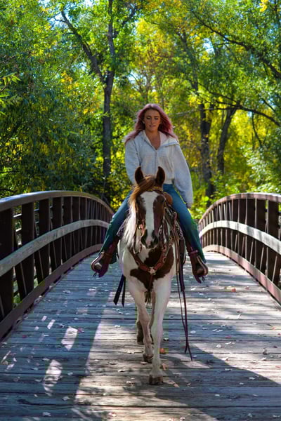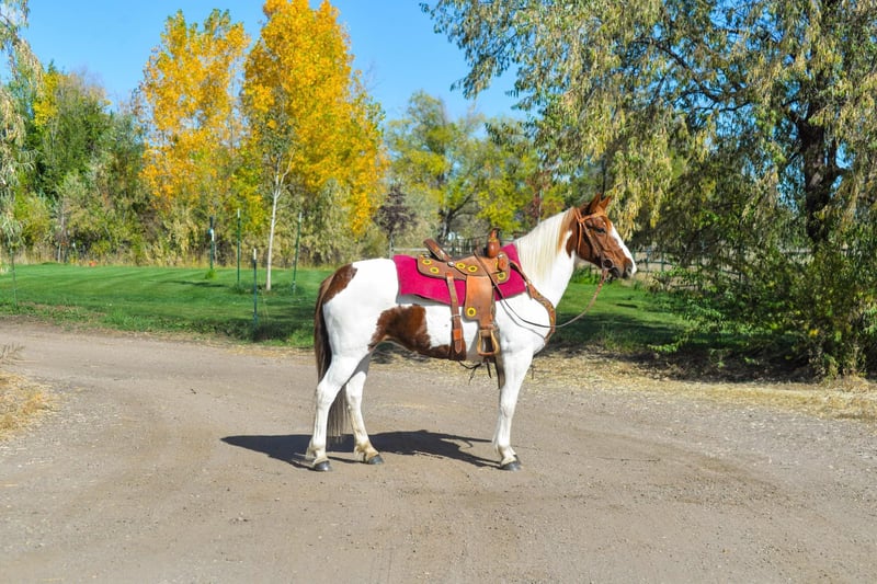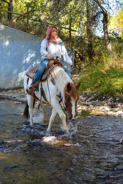 ONLINE AUCTION Place your bids at www.PlatinumEquineAuction.com Starting Bid $3500 Auction ends December 8th, 2024 Need a new saddle? Check out White Rock Saddles on our website or Facebook! Haven is a 10 year old (extremely eye catching) mustang paint mare! This mare is intelligent, athletic and EXTREMELY smart. This mare LOVES her job, she could work all day and still be having fun at the end of the day! She has been used for packing up into the mountains, hauling meat out and even seeing wild horses! She is great with steep terrain, knows how to use her hind end and if you drop your reins she’ll pick her way through rough territory! She has been in town as well, crossing bridges, around traffic (even with little kids on her) and around strollers,bikes and even a drive thru! She is fun! She has all the go and endurance you could ask for while being trustworthy, with a good brain. Haven has incredible feet and has been barefoot her whole life! We have carried flags on her, thrown tarps over and under her and messed around with trail obstacles, she is not hesitant to play with anything. Haven has a great collection and frame up, a smooth stop and rollback, flying lead changes, cross overs and is working on a finished neck rein. She is as handy in the arena as out with all of her desensitization, haven can still be untrusting on the ground. She loves having one owner and really needs a person that will spend time and bond with her Haven has been around the barrel pattern , is learning the poles and has even been roped off of making her a great all around mare for someone wanting to go any direction. This is a super fun mare (not to mention stunning) with a huge personality and a ton of brains. Don’t miss out!! Located in Fort Collins, CO. Contact Dynamite Horses Thea 970-632-3644 with any questions. ONLINE AUCTION Place your bids at www.PlatinumEquineAuction.com Starting Bid $3500 Auction ends December 8th, 2024 Need a new saddle? Check out White Rock Saddles on our website or Facebook!