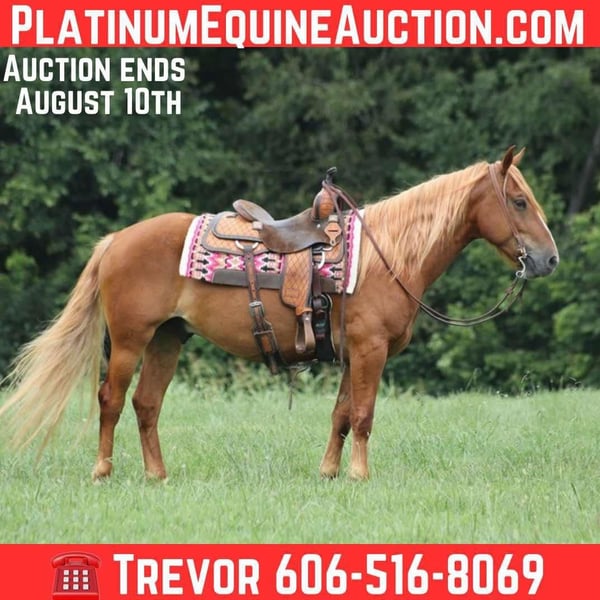 ONLINE AUCTION Place your bids at www.PlatinumEquineAuction.com Starting Bid $3500 Auction ends August 10th, 2025 Need a new saddle? Check out White Rock Saddles on our website or Facebook Introducing Mikey, the quintessential American Mustang you’ve been dreaming of! This magnificent Sorrel Flax M/T gelding is around 5 years old and he’s the true embodiment of the American spirit, and now you have the incredible opportunity to make him a part of your life! Standing a solid 15 hands tall, with strong, durable Mustang hooves and solid bone structure, he’s built to last and requires no maintenance—making him the ideal companion for years to come. Mikey lopes nice circles, walks out easily, has a smooth trot and lope. Whether you’re enjoying a leisurely ride in the arena or hitting the trails, Mikey is responsive and smooth. Speaking of trails, Mikey has traveled through some of the roughest country across the US. He’s not just a trail horse; he’s an adventure partner! With a lovely walk, he’ll cover ground like a pro. He’s been a reliable ranch horse, checking fences and gathering cattle. Navigating busy highways or steep mountains is a breeze for him, showcasing his sure-footedness and confidence in any terrain. Don’t miss out on the chance to bring this incredible Mustang home. Make Mikey yours today and experience the joy of a truly remarkable American Mustang! Come meet him and see for yourself! Need help with transport? No worries at all! We have a list of reputable haulers who can get him safely to your doorstep, whether you’re in Alaska, Mexico, Hawaii, Canada, or anywhere in between. Located in Parkers Lake, KY. Contact Trevor Patrick 606-516-8069 with any questions. ONLINE AUCTION Place your bids at www.PlatinumEquineAuction.com Starting Bid $3500 Auction ends August 10th, 2025 Need a new saddle? Check out White Rock Saddles on our website or Facebook