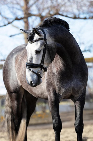 Pure Spanish Stallion (breed could not be changed in the ad) Hermoso is very well-behaved in daily handling and stands quietly for grooming and farrier work. He loads very calmly into the trailer and walks confidently next to traffic – no problem at all. Liberty work is very enjoyable with him, and he is lunged in all gaits. He is familiar with saddle, pad, girth, and bridle. He is currently in training for starting under saddle.
