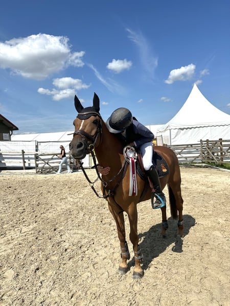 Étant donné que mon temps avec mon poney se termine cette année, je mets en vente mon poney Orchid’s Raimond. Il est arrivé chez nous en 2022 et j'ai sauté avec lui en épreuves allant de E à M. Il se bat toujours pour son cavalier en parcours et est parfait pour le style et le chrono en saut d'obstacles. « Fire » souhaite toujours faire un sans-faute et aide aussi son cavalier lorsque ce n’est pas parfait ! Il est agile, naturellement rapide et a de nombreuses classements de E à M en saut d’obstacles. Par exemple : • Vainqueur du CWD Kids Cup 2023 (A** avec barrage) • Vainqueur du classement général de la Pony-Trophy Tour 2024 (3e place en finale dans le 115 cm avec barrage) • Champion du district en 2022, 2023 et 2025 ! • Vainqueur au Turnier der Sieger à Münster (110 cm avec barrage) • Victoire internationale en 110 cm à Hagen + autres classements internationaux • Classement international en 115 cm à Peelbergen • 2e place en 120 cm lors du Ponyturnier à Xanten C’est un vrai collectionneur de rubans et on peut toujours compter sur lui ! Il sera vendu uniquement à des personnes de confiance et en de très bonnes mains ! Pour toute question ou pour plus d’informations, je suis à votre disposition. Visite et essayage possibles sur rendez-vous. Téléphone : 0173 8736775
