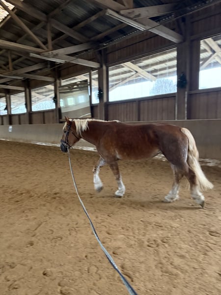 For sale is our gentle Noriker mare Selina, born in 2017. Selina is an absolute sweetheart when it comes to handling: very well-behaved, calm, and reliable. She shows no signs of skittishness and is unafraid of cars, tractors, front loaders, or other environmental stimuli. This makes her an excellent choice for nervous riders, beginners, or for therapeutic riding programs. She is already a mother of a foal and is ideally suited as a broodmare. Additionally, Selina is backed and familiar with work in harness. Due to stiffness in her hindquarters, she is not suitable for sport. Therefore, we are offering her solely as a leisure horse, therapy horse, or broodmare. With gentle retraining and patience, someone who takes the time to re-educate her will find a loyal companion for life in Selina. Selina impresses with her calm nature, her affinity for people, and her reliability – a true dependable partner for anyone seeking an honest horse. Likely also of interest to breeders. 📍 Further information, photos, or videos available upon request.