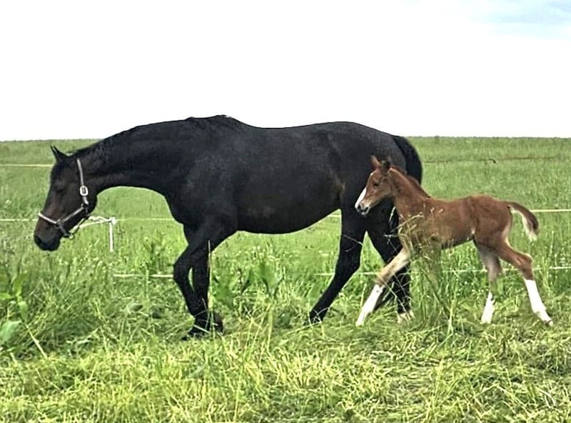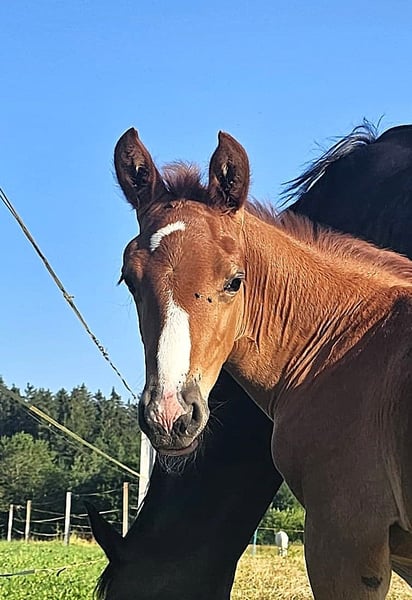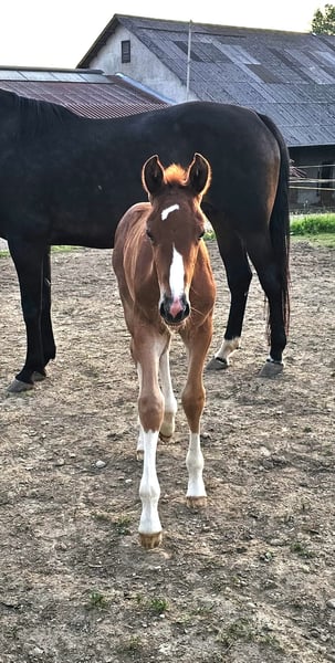 Due to breeding retirement and an upcoming stay abroad, this handsome and well-behaved colt by BENICIO is available for sale. He has excellent movement, is long-legged yet bone-strong, elegant, correct, and full of charm. He is very trusting and will grow to a large size. His dam is 176 cm (about 16.1 hh), and he is a full brother to a 2023 foal already reaching 170 cm (around 16.3 hh). The dam is also for sale, either separately or together. Born in May 2025, dark chestnut, Oldenburg line 74.