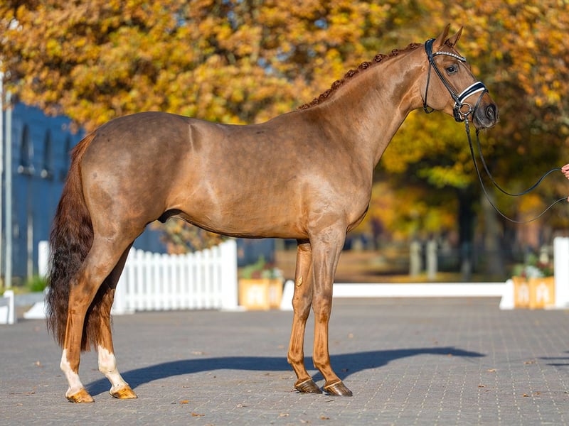 Mc Laren/Bordeaux/Di Versace This strongly built, expressive chestnut stallion with a commanding presence is well-suited for the grand prix arena. Standing as a proven sire, he combines the modern type and impressive movement of his sire Mc Laren with the breeding reliability of his grandsire Bordeaux, renowned for producing top-level grand prix horses. His sire, Mc Laren, who gained fame under Dinja van Liere as one of the rising stars in Dutch dressage, has achieved success up to Intermediaire I and Prix St. George levels. Performance Highlights: Sire: 35TT, focus on dressage (NL), 83.50 points; DPF L winner/qualified for BuCha, 5-year-old DPF; DRE Intern. PSG winner; DRE Intern. IM I successful; according to FN, three licensed sons. Dam: Granddam: RPF successful; four sport successful offspring: Vilancio’s Valeria (v. Vilancio) DPF A/DRE L* winner, successful in DPF L and DRE M*; San Pellegrino 9 (v. San Amour I) DPF A/DRE M** successful; Hemingway 55 (v. Hotline) RPF successful; Federer (v. Foundation) DRE PSG (USA) winner. Great-granddam: 1 successful sport offspring. Oldenburg Mare Line 128 Licensed stallions include: Diego de Silva (v. Don Olymbrio L), Radcliffe (v. Rivero II) DRE S* successful, Delfine Dynamic (v. Danciano) RPF winner; Landes- and South German Champion 3-year-old RPF stallions; N.N. (v. Monte Bellini; Sport: Monte Kahlo); Gratino (v. Grannus); Sensation (v. Sir Heinrich); Veneno HC (v. Vitalis); Spirit of the Age (v. Stedinger) DRE Intern. GP successful; It’s Otto (v. Etoulon VDL); Richard Löwenherz (v. Rubinstein I) DRE Intern. IM I and European Young Rider Champion successful; Copperfield (v. Classiker); Sir Caramello (v. Sir Donnerhall I) DRE Intern. GP successful. Successful show jumpers include: Seneca de Panoly (v. Calvaro Z) SPR Intern. 150cm, Katre d’Elite (v. Paladin des Ifs) SPR Intern. 150cm, Mat’s up du Plessis (v. Verdi) SPR Intern. 160cm, Lubie du Plessis (v. Le Tot de Semilly) SPR Intern. 145cm, Sandro Star 5 (v. Sandro Hit) SPR Intern. 145cm, Charlon (v. Chalan) SPR Intern. 145cm, Cuba Libre (v. Cornet Obolensky) SPR Intern. 140cm, Call on me 6 (v. Check In) SPR Intern. 140cm, Elixer (v. Zacharov TN) SPR Intern. 145cm, Quirinia (v. Quaid I) SPR Intern. 145cm. Successful dressage horses include: Diaboletta (v. Diamond Hit) DRE S*, Don Etoile F.S. (v. Don Diamond) DRE IM I, Pandora 183 (v. Rivero II) DRE IM I, successful in Young Rider Tour; Rubina 152 (v. Rubirando) DRE IM I; Joy of Jazz (v. Jazz) DRE S*, Benvenuto 11 (v. Boston) DRE IM I; Big Bang 4 (v. Boston) DRE IM I; Sir Rubin 3 (v. Sir Donnerhall I) DRE S*/DRE Intern. Children’s Tour; Hoejgaards Dexter (v. Dolany) DRE Intern. GP (CDIU25). For more details, visit: https://horse24.com/de/auctions/details/5-mecklenburger-koertage-online-auktion-454 Contact: Jannes Sonnenberg Phone: 0170 5417431