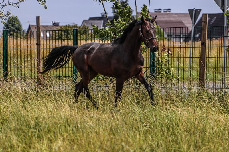 Dexter ma obecnie 3 lata i czeka na rozpoczęcie pracy. Z każdym dniem staje się coraz piękniejszy i myślę, że jest tego świadomy. Obecnie jeszcze chętnie biega swobodnie i skacze na luzie. Na przednich nogach ma mały chip, który można bez problemu usunąć. Nigdy nie był kulawy, dlatego jego cena jest nieco niższa. Posiada ogromne podstawowe predyspozycje, szczególnie dzięki bardzo aktywnej tylnej kończynie.