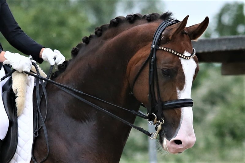 A Dream Stallion in Choccofuchs with plenty of white Born in 2017, standing at 17.4 hands, he is a multiple-winning M-level dressage horse and has achieved S-level placings. Riding him is a true pleasure. He delivers powerful impulsion from behind, and all three basic gaits are outstanding. He exhibits excellent rhythm, suppleness, uphill tendency, lightness, and an exceptional character. As a stallion, he is very easy to handle and completely well-behaved, even at competitions.