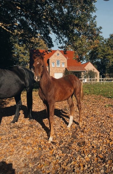 Verbandsprämiertes Oldenburger Hengstfohlen von Le Formidable aus einer Hauptprämienstute von Desperado x Florencio I x Feiner Stern x Figaro x Kronprinz Unser typvolles Hengstfohlen in herrlicher Dunkelfuchsjacke aus dem Stamm der Irnanda sucht noch ein neues Zuhause!! Ein sehr edles Fohlen, schön im Genick und mit 3 guten Grundgangarten (speziell auch einem sehr guten Schritt) und viel Schub aus dem Hinterbein ausgestattet. Er ist sehr entspannt und brav im Umgang, regelmäßig entwurmt und dem Schmied vorgestellt. Durch das Bauernhofleben bei uns kennt er Trecker, Kühe, Hunde, viele Kinder usw. Da unser anderes Hengstfohlen Anfang November auszieht, suchen wir für ihn noch ein liebevolles Zuhause! Wir möchten ihn ungern allein aufziehen. Er wird demnach gemeinsam mit seinem Kumpel Anfang November abgesetzt und kann dann ebenfalls umziehen. Es gilt daher Platz vor Preis!! Anfragen vorzugsweise telefonisch!
