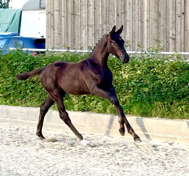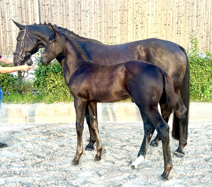 Schicker, auffällig gezeichneter und bewegungsstarker Rapphengst mit top Pedigree! Vollbruder zur Mutter GP-erfolgreich.