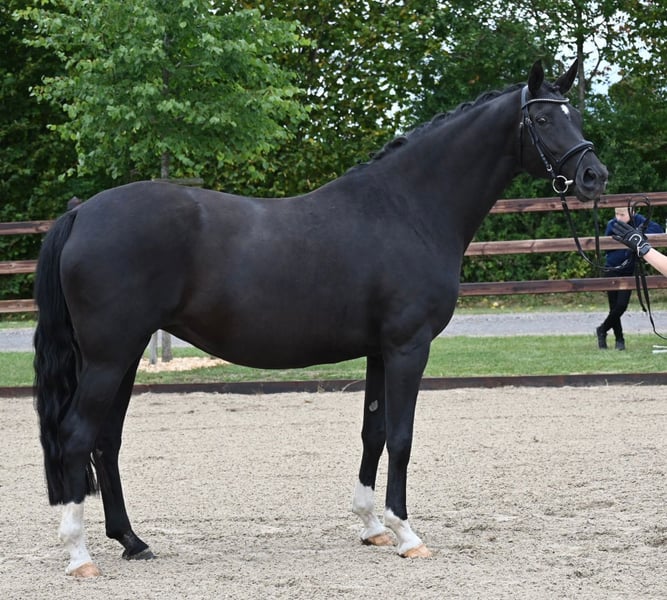 Love Romance… duża, piękna klacz z holsztyńskiej linii Love Story. Odniosła sukces na Vechta, kończąc z powodzeniem próbę dzielności (SLP) i otrzymała odznaczenie nagrodą związkową. Love wydała nagrodzone i aukcyjne źrebięta. Posiada wyjątkowo delikatny i uroczy charakter, jest bardzo dobrze ujeżdżalna i dobrze współgra w grupie klaczy. Możemy ją również wyobrazić sobie jako rodzinnego i rekreacyjnego konia. Na sezon hodowlany 2026 nie jest pokryta. Chętnie oddalibyśmy ją w piękne i pełne szacunku miejsce. Więcej informacji pod numerem 01749049299.