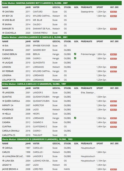 Un'opportunità unica per gli allevatori! Miss Blue ha già dimostrato il suo valore come fattrice, avendo dato alla luce Crystal Blue OLD, ora residente negli Stati Uniti. Altri suoi discendenti sono attualmente impegnati in attività di breeding o in fase di avviamento nel mondo dello sport. Attualmente, non è in gravidanza. Suo padre, Mr. Blue, ha prodotto stalloni come Zirocco Blue e Plot Blue. Sua madre, Samona, figlia di Sandro Boy, ha dato origine a My Boy, che si è piazzato in competizioni di ostacoli fino a 1,45 m e in gare di barrier, e Daimler, attualmente impegnato in salti fino a 1,35 m. La seconda madre, Landora, ha dato i suoi migliori discendenti tra cui gli stalloni approvati Casino Berlin OLD, terzo ai Campionati tedeschi sopra i 1,55 m, e Casirus, che si è distinto a livello internazionale in competizioni di altezza superiore a 1,60 m. Anche altri suoi discendenti si sono fatti valere nel mondo dello sport, tra cui My Ferrari, piazzato oltre i 1,50 m. Nel suo ceppo genealogico si trovano anche i rinomati saltatori Diagonal, Locadeur, Carlos e Jackie Brown, quest’ultima con successi sotto Meredith Micheals-Beerbaum oltre i 1,60 m.