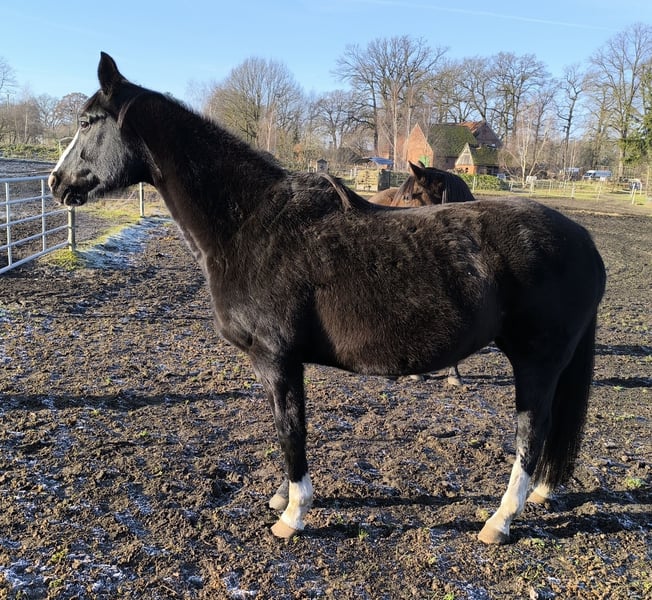 Schicke, liebenswerte 15jäh. Rappstute von Sandro Hit x Akzent / Cardinal xx. Wurde 4jäh. angeritten, ging dann in die Zucht und wurde im Winter 24/25 wieder angeschoben und geritten. Im Frühjahr 25 von uns übernommen ist es nicht gelungen, sie mit unserem Wallach zusammenzubringen, er akzeptiert sie einfach nicht. Da die Stute daher sehr unglücklich ist, sucht sie ein schönes neues zu Hause als Freizeitpferd oder für die Zucht. Sie ist ein Familienpferd mit sehr ausgegelichenem Charakter, anfänglich etwas skeptisch, taut aber schnell auf wenn man sich mit ihr beschäftigt und sie wird gerne betüddelt. Den letzten Sommer nicht mehr gearbeitet, muss sie wieder angeschoben werden. Unsere Pferde kennen eine Box nur nachts im Winter. Die Stute ist gesund und ohne Unarten. STM ca. 164cm.